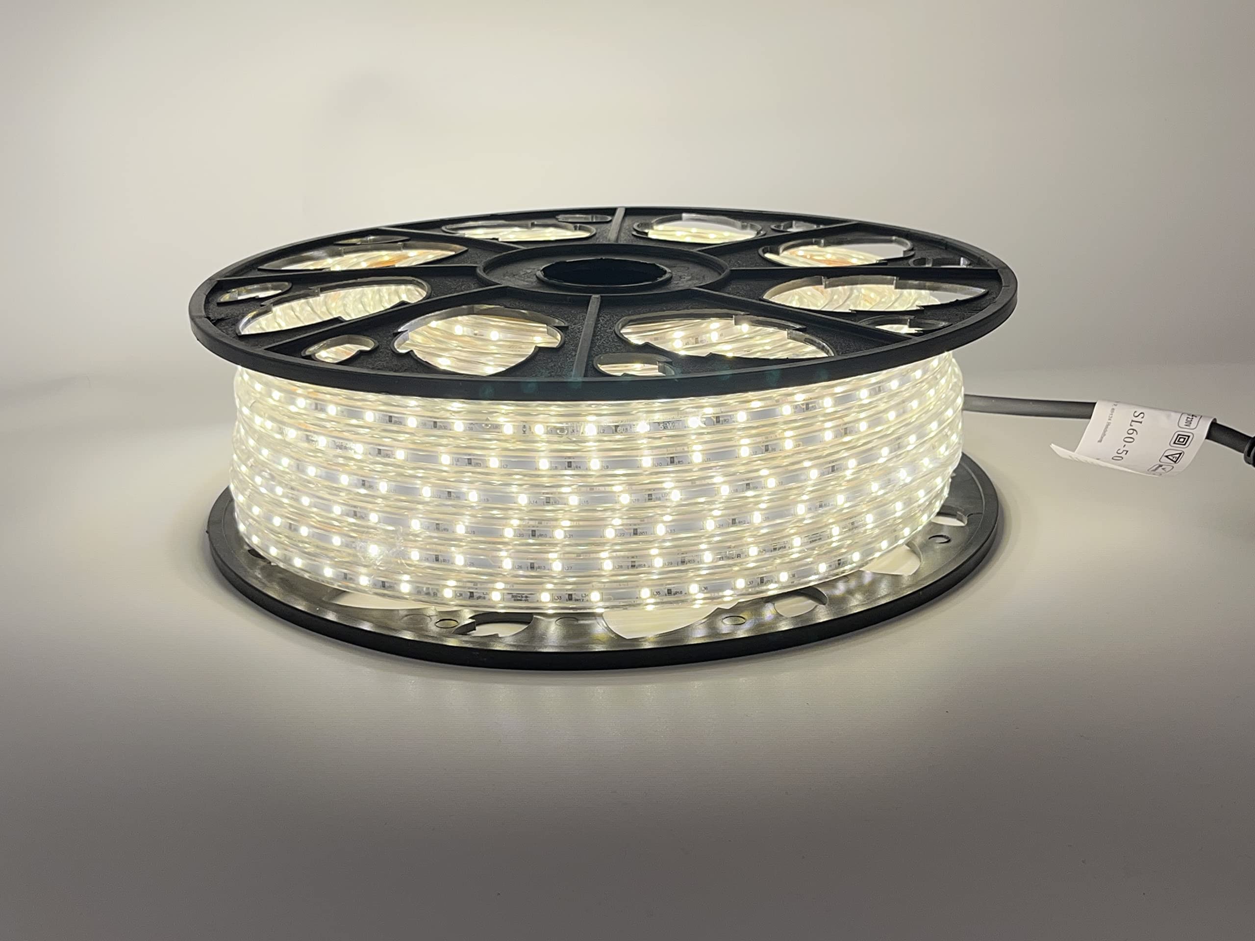- Questa striscia LED professionale, lunga 50 metri più un cavo di alimentazione staccabile di 1,5 metri, ha una sezione di 12 x 6 mm e integra 60 LED SMD2835 al metro, emettendo luce bianca calda a 3000K.