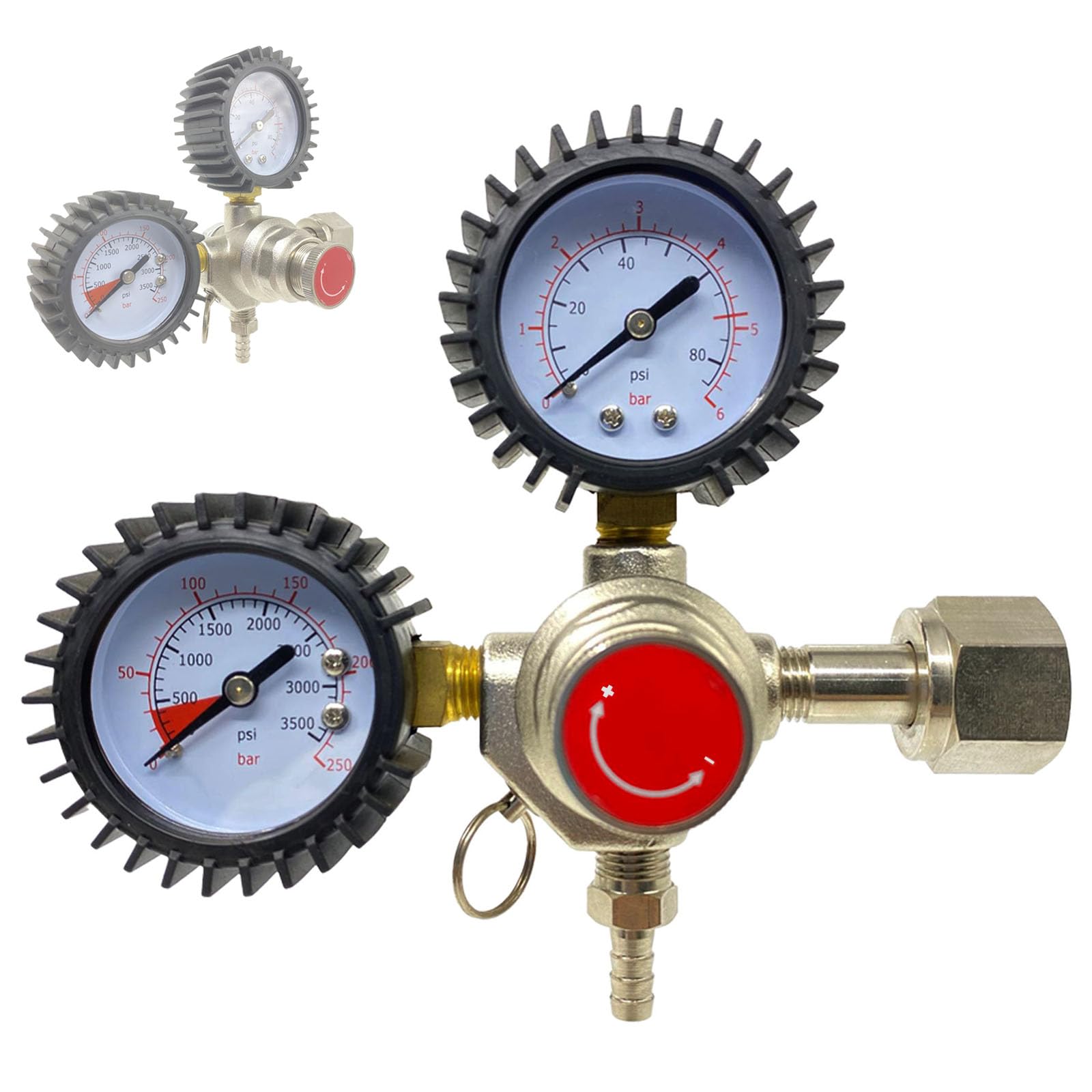 - Dotato di due manometri, questo riduttore di pressione CO2 visualizza la pressione di uscita (0-80 psi / 0-6 bar) e la pressione del serbatoio di CO2 (0-3500 psi / 0-250 bar), consentendo un monitoraggio costante tramite doppie scale.