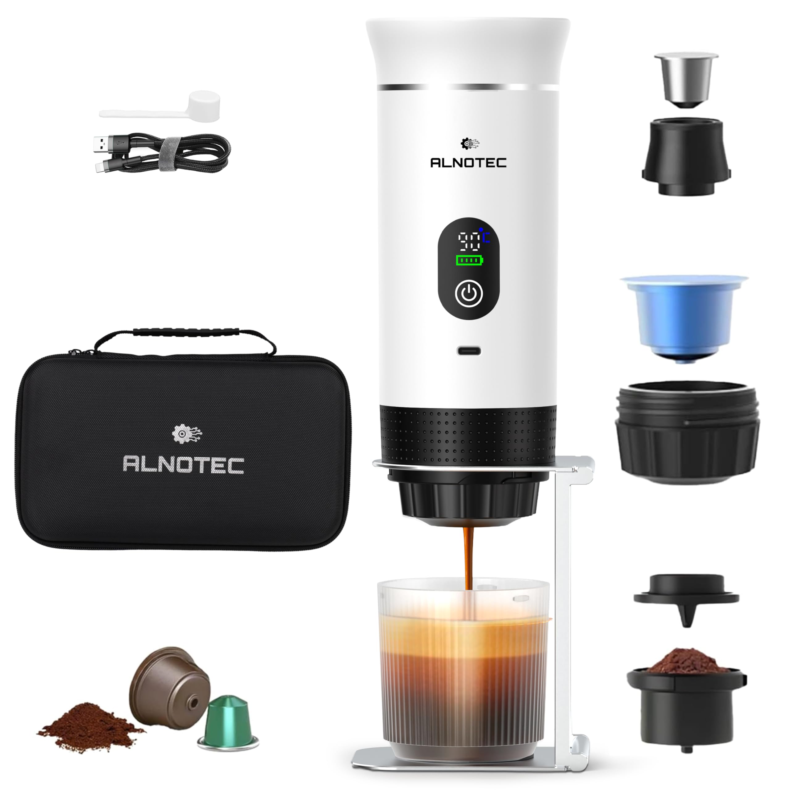 - ✅ Caffettiera Espresso ALNOTEC - Pacchetto completo Edizione 2025 👍 Concedetevi l'esperienza caffè definitiva con questa nuova versione all-in-one: ⚡ Macchina portatile ricaricabile, compatibile capsule NES, DG e caffè macinato grazie agli adattatori inclusi. Ricarica semplice tramite cavo USB-C (adattatore non incluso). Display LED integrato: traccia in tempo reale la temperatura di riscaldamento, il livello della batteria e l'estrazione corrente. Custodia inclusa per trasportare la macchina in modo sicuro, ovunque tu vada. Supporto antigoccia rimovibile, perfetto per uso interno ed esterno.