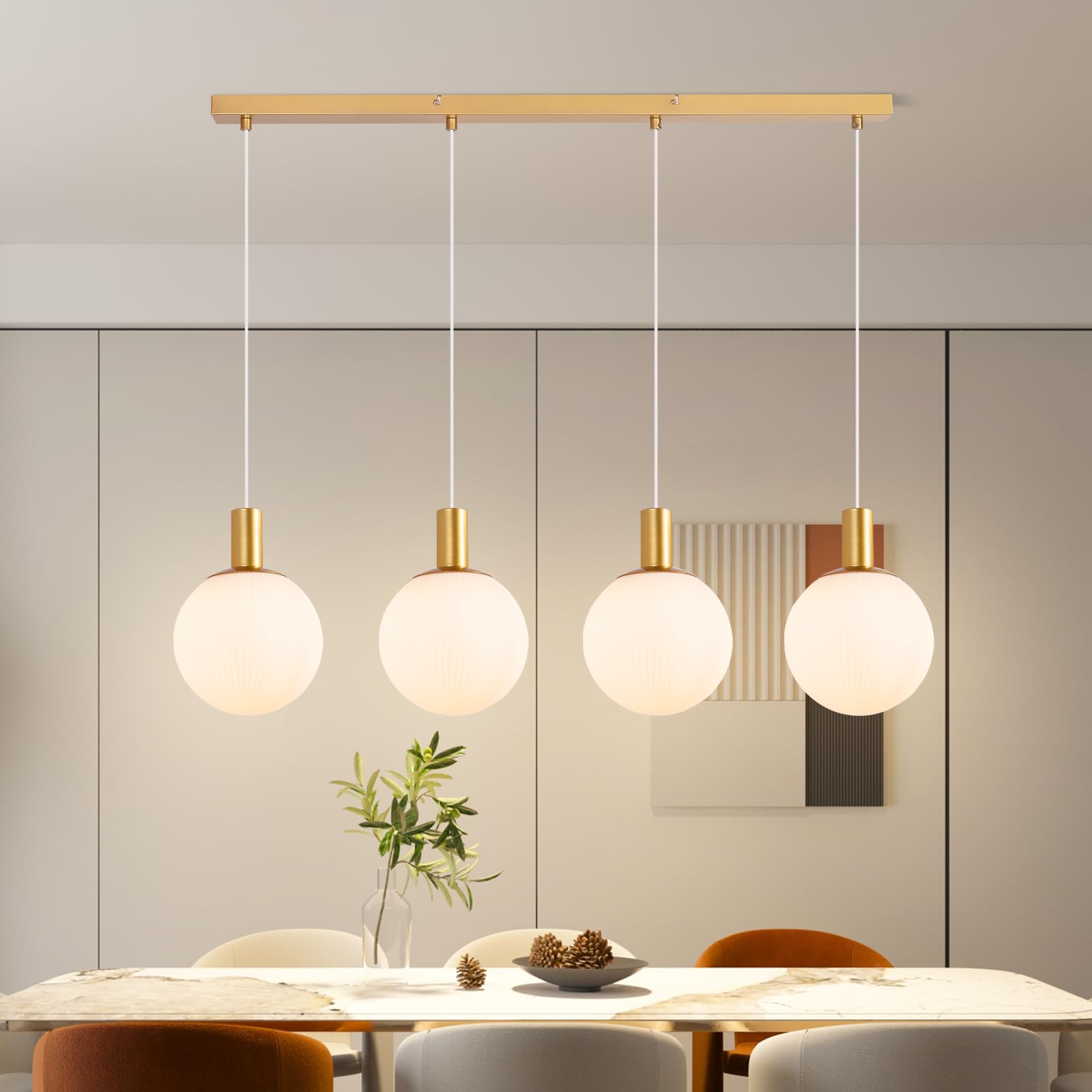 - Questo lampadario a sospensione per cucina presenta un design minimalista ed elegante, combinando una moderna finitura dorata con la luce soffusa delle sfere di vetro bianco, creando un'impressione duratura. Le linee pulite degli elementi a soffitto aggiungono profondità visiva, mentre le sfere di vetro offrono un'illuminazione calda e uniforme, generando un'atmosfera di moda e comfort.