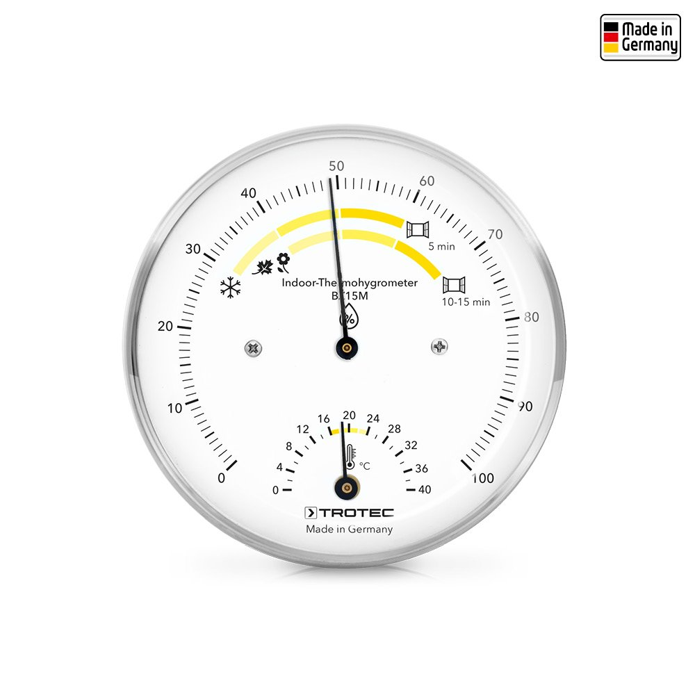 - Dotato di un meccanismo di misurazione di alta qualità 'Made in Germany', esente da manutenzione, il BZ15M garantisce una precisione di ± 3% r.F. nell'intervallo di umidità relativa dal 20 al 100%. Il meccanismo rileva le variazioni di lunghezza di una fibra sintetica trattata, che si espande o si contrae con l'umidità.