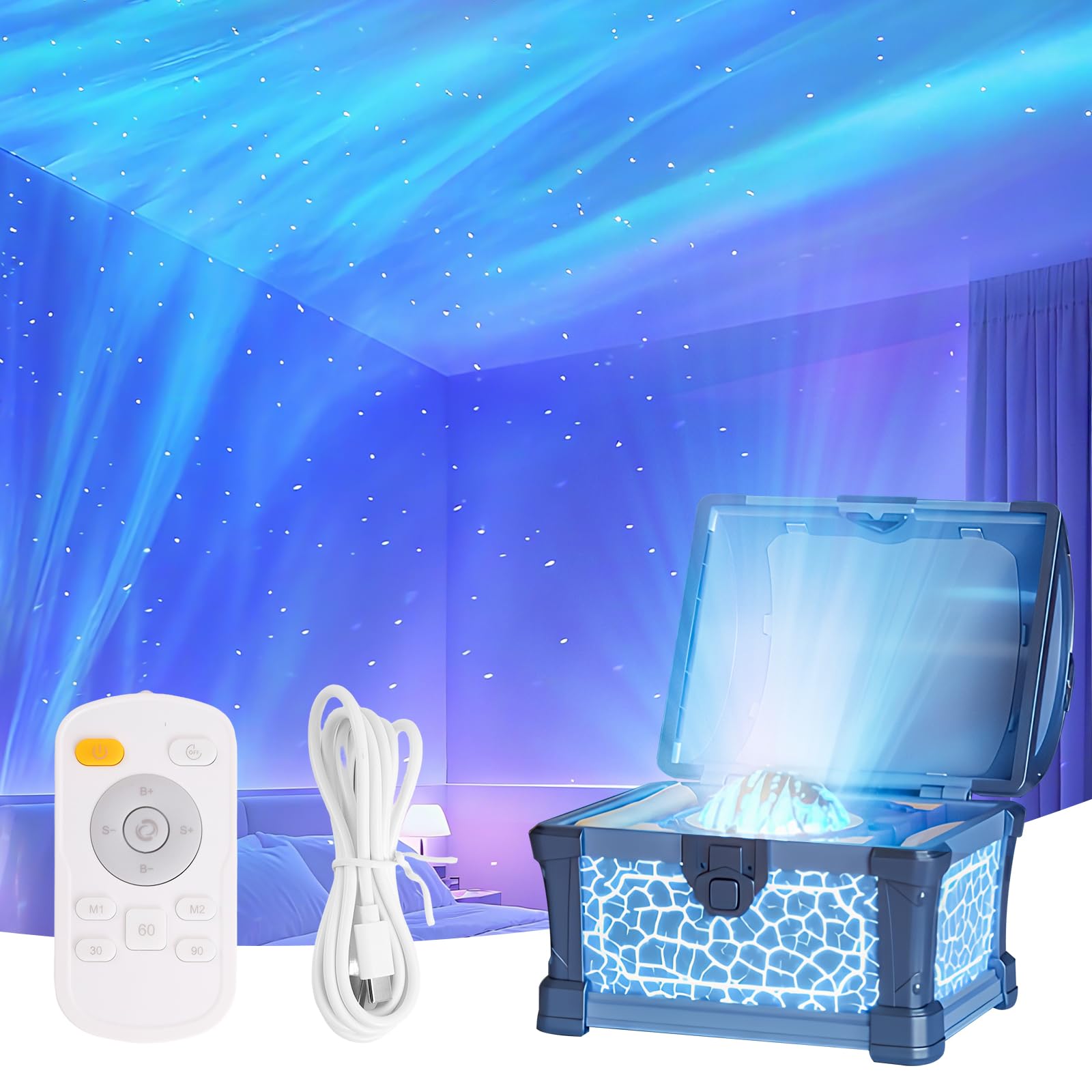 - 【Design Retrò da Scrigno del Tesoro】Magico scrigno del tesoro con proiezione dell'aurora boreale. Questo scrigno del tesoro in stile antico con effetto screpolato, finiture in metallo e robuste serrature emana un fascino rustico. Una luce misteriosa brilla attraverso le fessure traslucide, trasformando qualsiasi stanza in un regno fiabesco: perfetto come luce notturna per bambini o proiettore di galassie