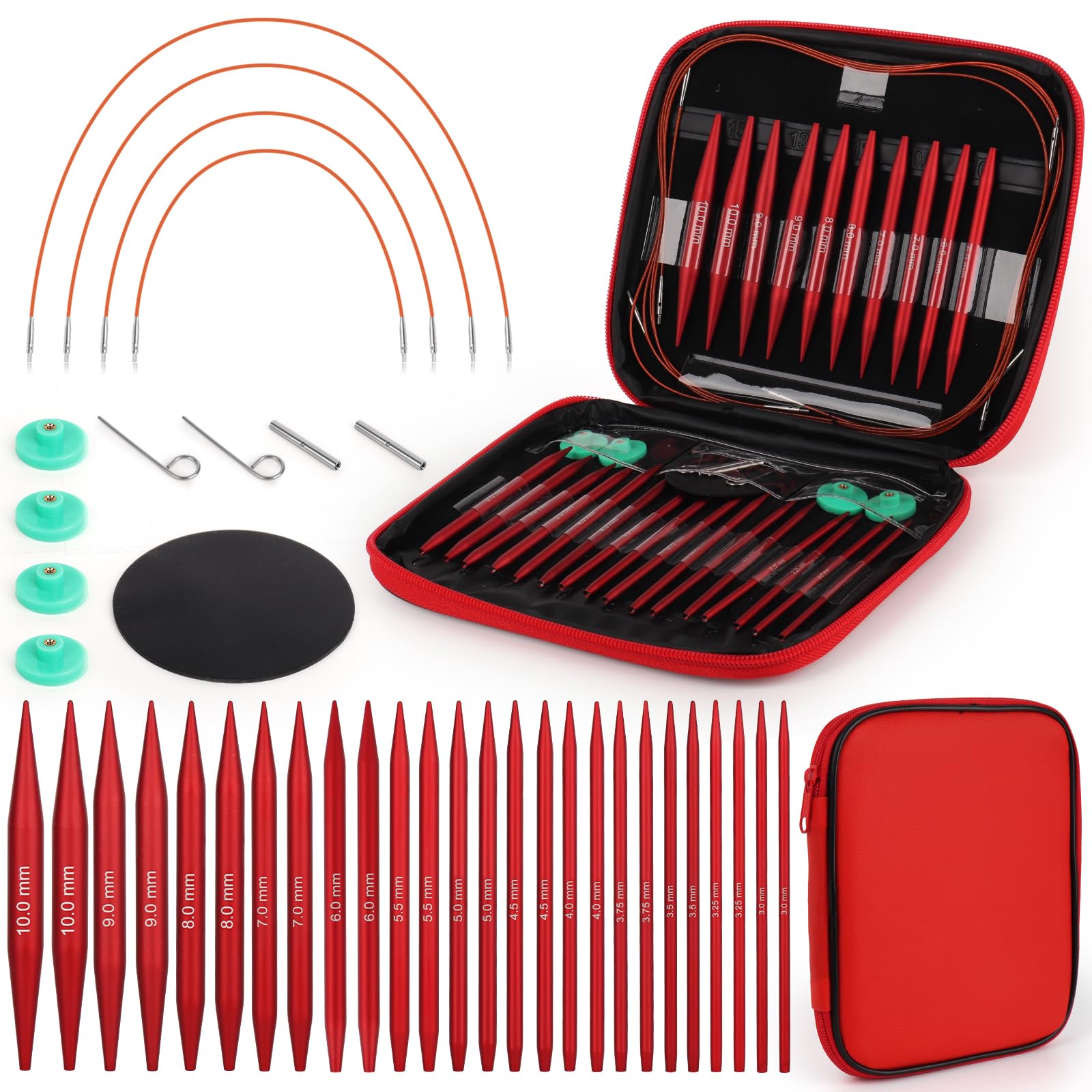 - Ferri Circolari Intercambiabili: questo squisito kit per principianti include 13 paia di ferri circolari in 13 misure: 3,0 mm/3,25 mm/3,5 mm/3,75 mm/4,0 mm/4,5 mm/5,0 mm/5,5 mm/6,0 mm/7,0 mm/8,0 mm/9,0 mm/10,0 mm. Offre inoltre una varietà di lunghezze di cavo, connettori per cavi, cappucci terminali, cavi rotondi, chiavi di fissaggio, strumenti di pubblicazione e un'elegante scatola portaoggetti che mantiene tutto in ordine, ideale sia per principianti che per magliai professionisti
