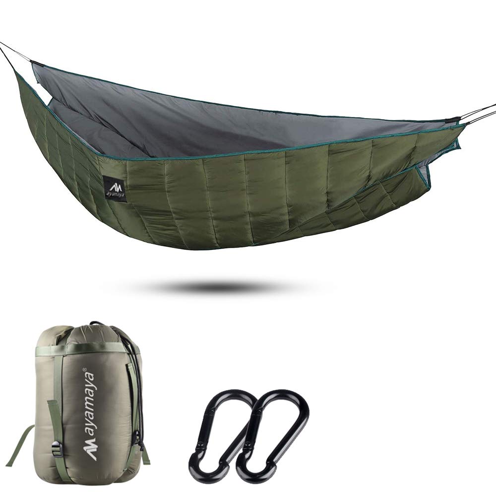 - Veloce e facile da appendere: è facile da installare e protegge dal freddo dal basso, si può applicare rapidamente sotto l'amaca semplicemente tirando il tappetino attraverso i passanti della trapunta e agganciando i moschettoni della trapunta alla tensione dell'amaca