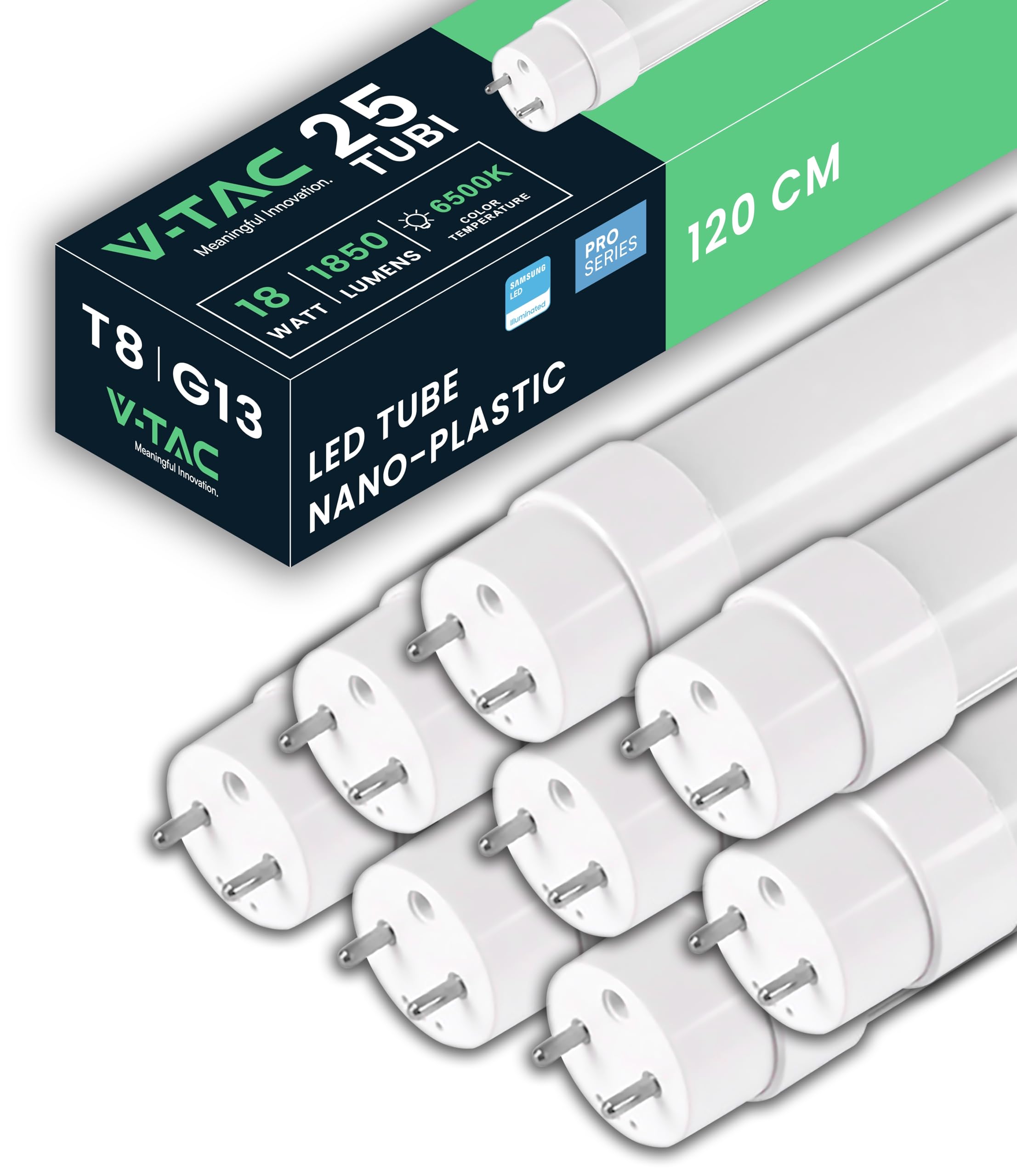 - CONFEZIONE DA 25 TUBI LED 120 CM V-TAC: Con una potenza di soli 18W e un flusso luminoso di 1800 lumen, il tubo LED V-TAC offre un'efficienza straordinaria di 100 lm/W, garantendo risparmio energetico e prestazioni elevate.