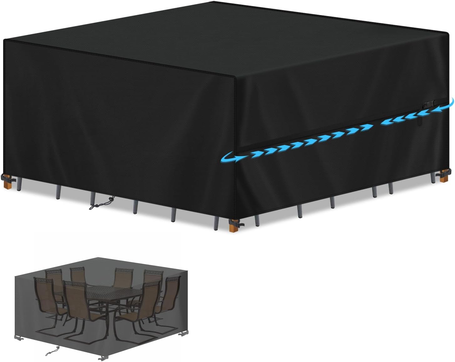 - [Dimensioni e applicazione] 250x250x90cm(LxWxH). La copertura mobili da esterno è nera, adatta a coprire tavolino e sedie da esterno, tavolo da giardino,tavoli da pranzo, salottino da giardino esterno, tavolino da balcone, divano da esterno e set di mobili da giardino in rattan per mantenerli asciutti e resistenti. Si prega di misurare i mobili da esterno prima di ordinare per garantire che la copertura si adatti correttamente