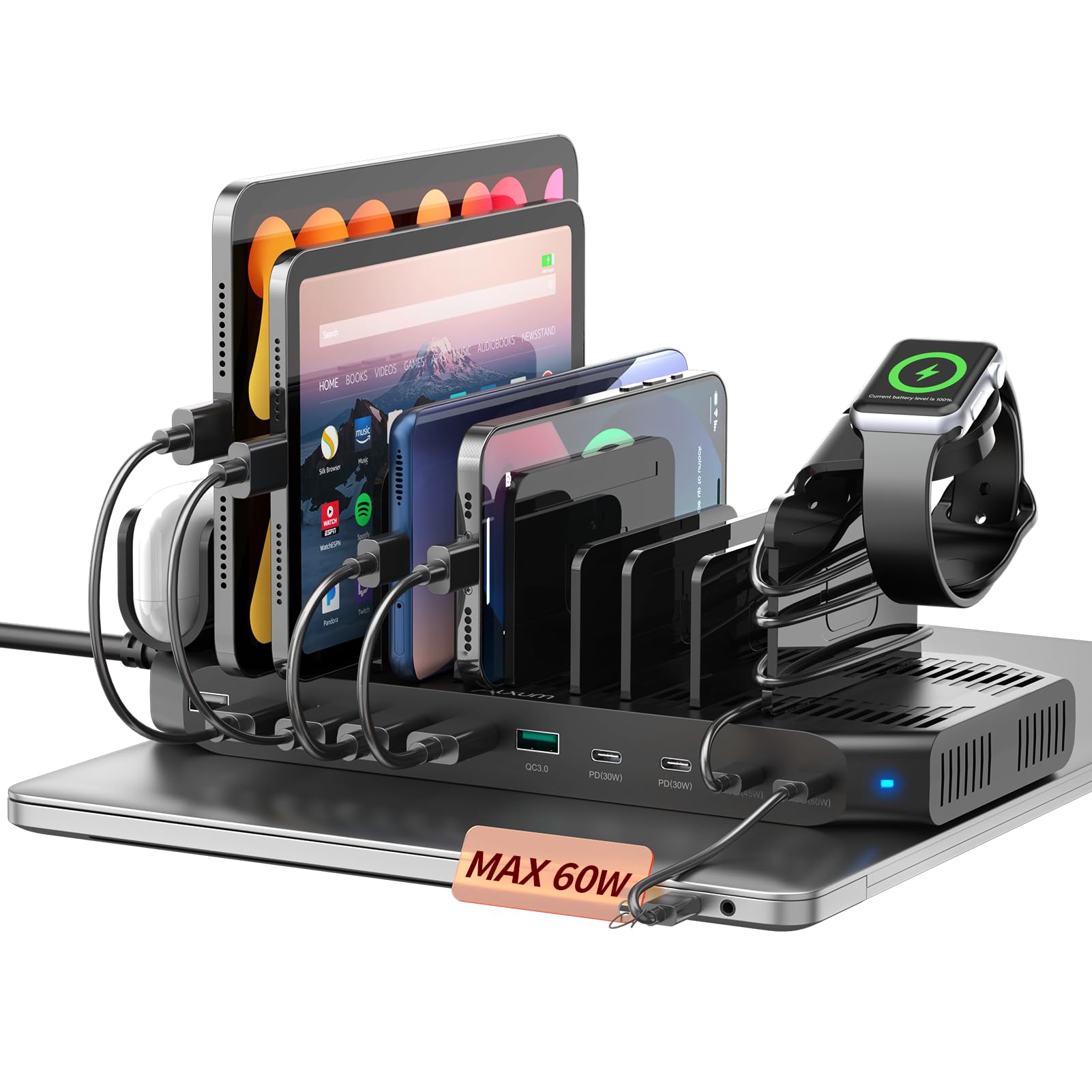 - Il design compatto della stazione di ricarica Alxum include supporti dedicati per Apple Watch e cuffie, permettendo di caricare tutti i dispositivi (telefoni, Apple Watch, laptop) in un unico luogo, mantenendo l'ambiente ordinato e organizzato, ideale per qualsiasi utilizzo.