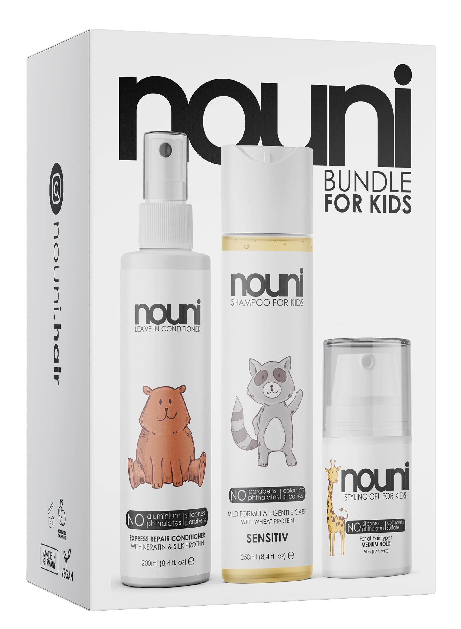- Prodotto in Germania, in modo da avere il pieno controllo sui nostri prodotti. Il nostro balsamo per bambini protegge da rotture di capelli, capelli fragili o doppie punte e, come tutti i prodotti Nouni, è 100% privo di crudeltà sugli animali.