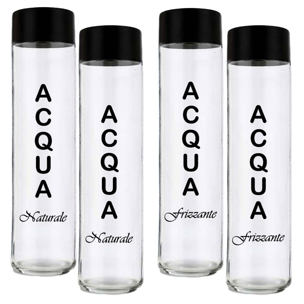 - 💎 Design Elegante e Raffinato: Set di 4 bottiglie in vetro trasparente modello "Cilindro", ideale per servire acqua naturale e frizzante con stile. La serigrafia distintiva facilita il riconoscimento delle bevande a tavola.