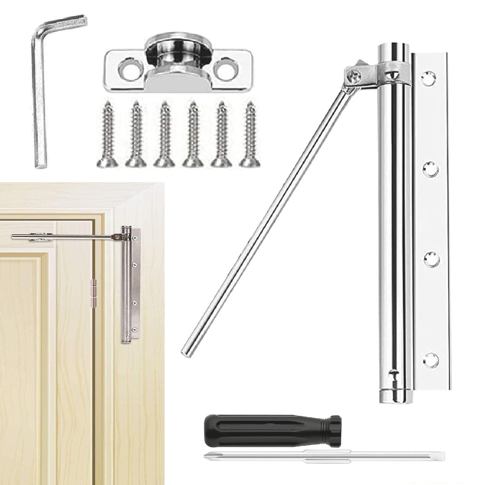 - Facile da usare: questo chiudiporta interno è facile da installare e deve semplicemente essere installato e avvitato tra i telai delle porte. È possibile installare sia la porta sinistra che quella destra. Può anche essere montato a parete. Connessione filettata, montaggio e smontaggio convenienti, uso durevole, silenzioso e regolare, efficienza e praticità migliorate.