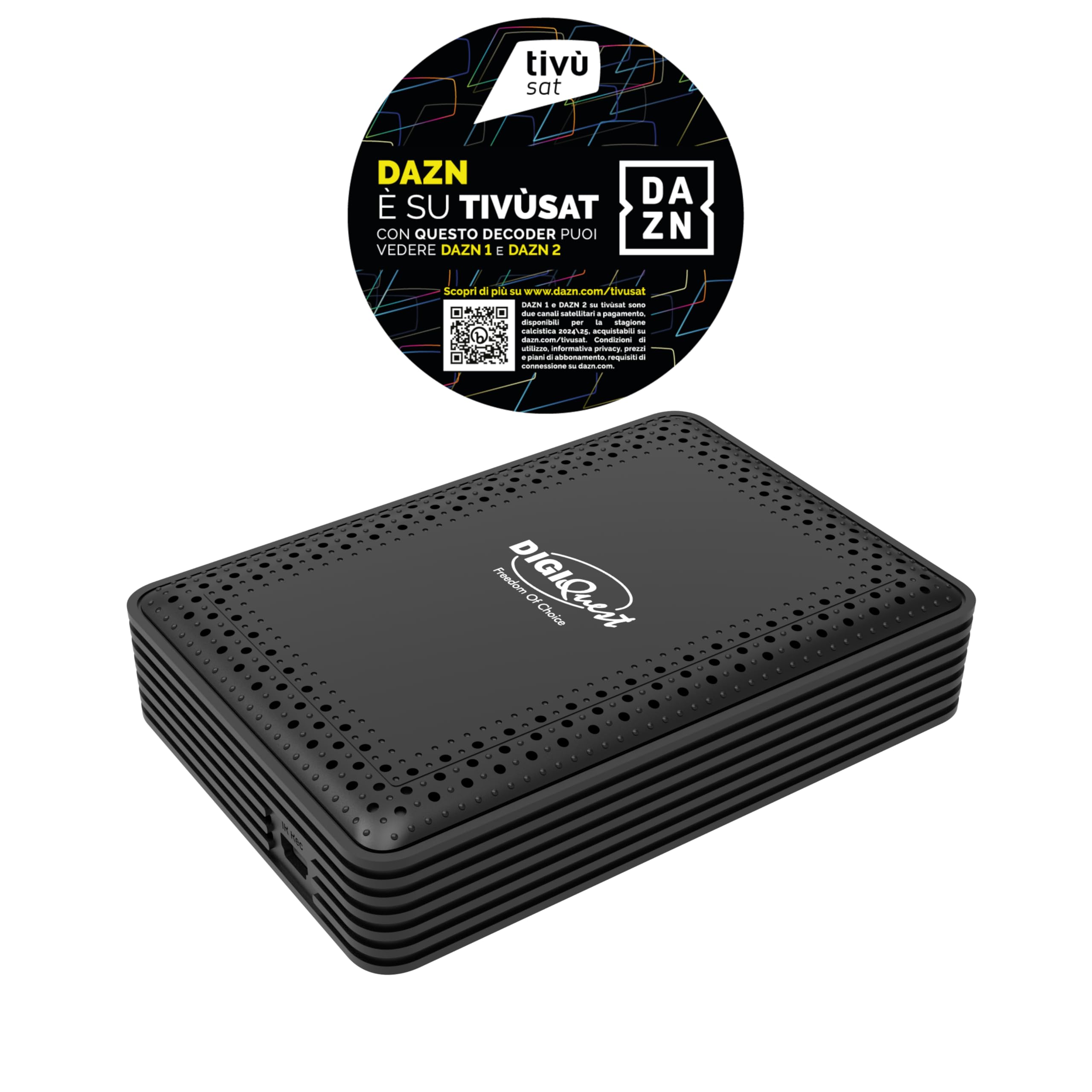 Auto-installante · Telecomando 2in1 · SIMcard Tivùsat inclusa · Registrazione attivabile · Canali DAZN
