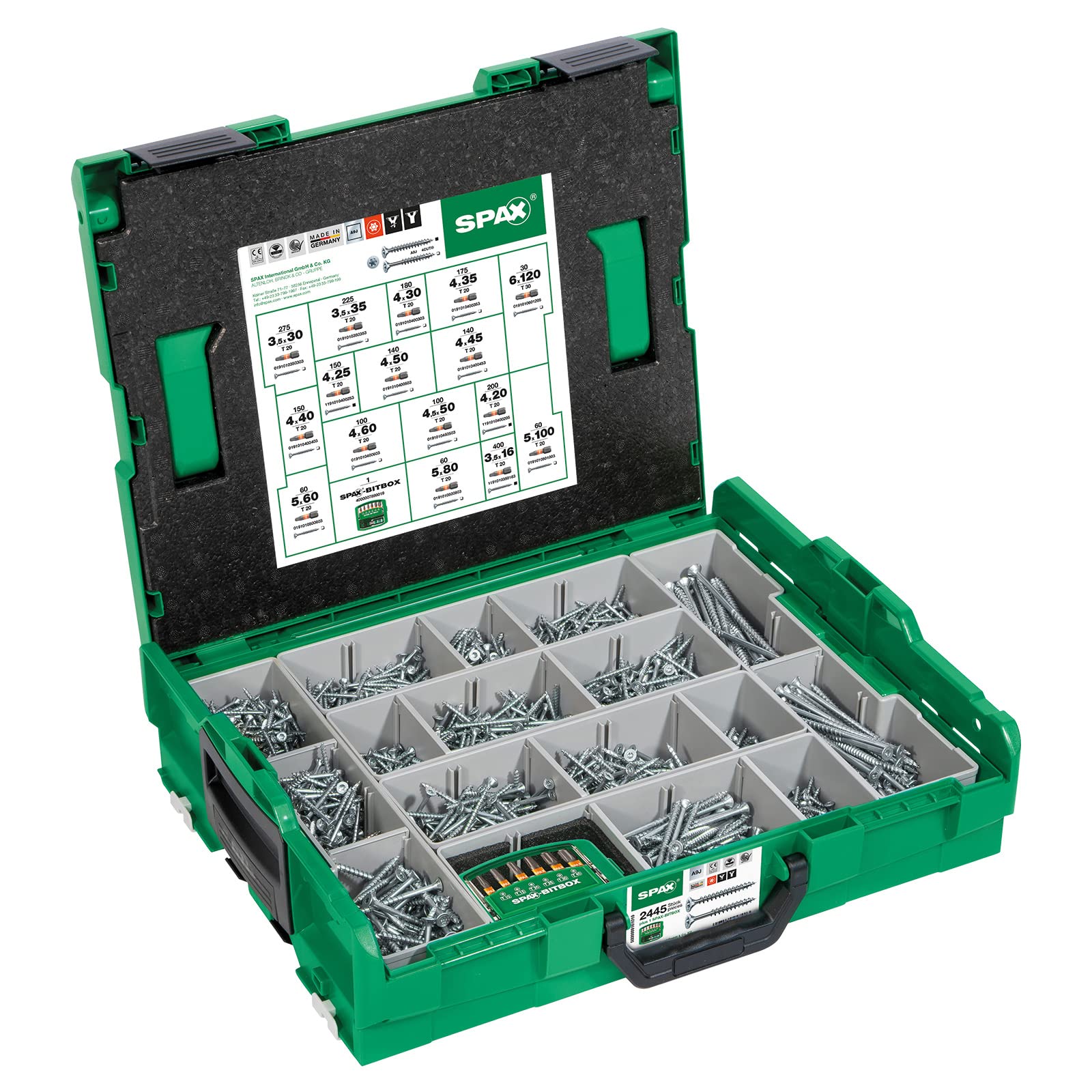 - La robusta valigetta in plastica, dotata di manico, contiene viti di 16 diverse dimensioni e un pratico BIT-Check SPAX con inserti di 6 dimensioni e portainserti Rapidaptor.