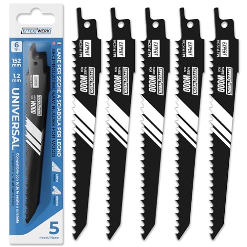 - Il set include 5 lame di ricambio per sega a sciabola alternativa (152 x 19 x 1,2 mm) con configurazione a 6 TPI, che assicurano tagli lisci e precisi. Le lame sono compatibili con tutti gli utensili per sega standard.