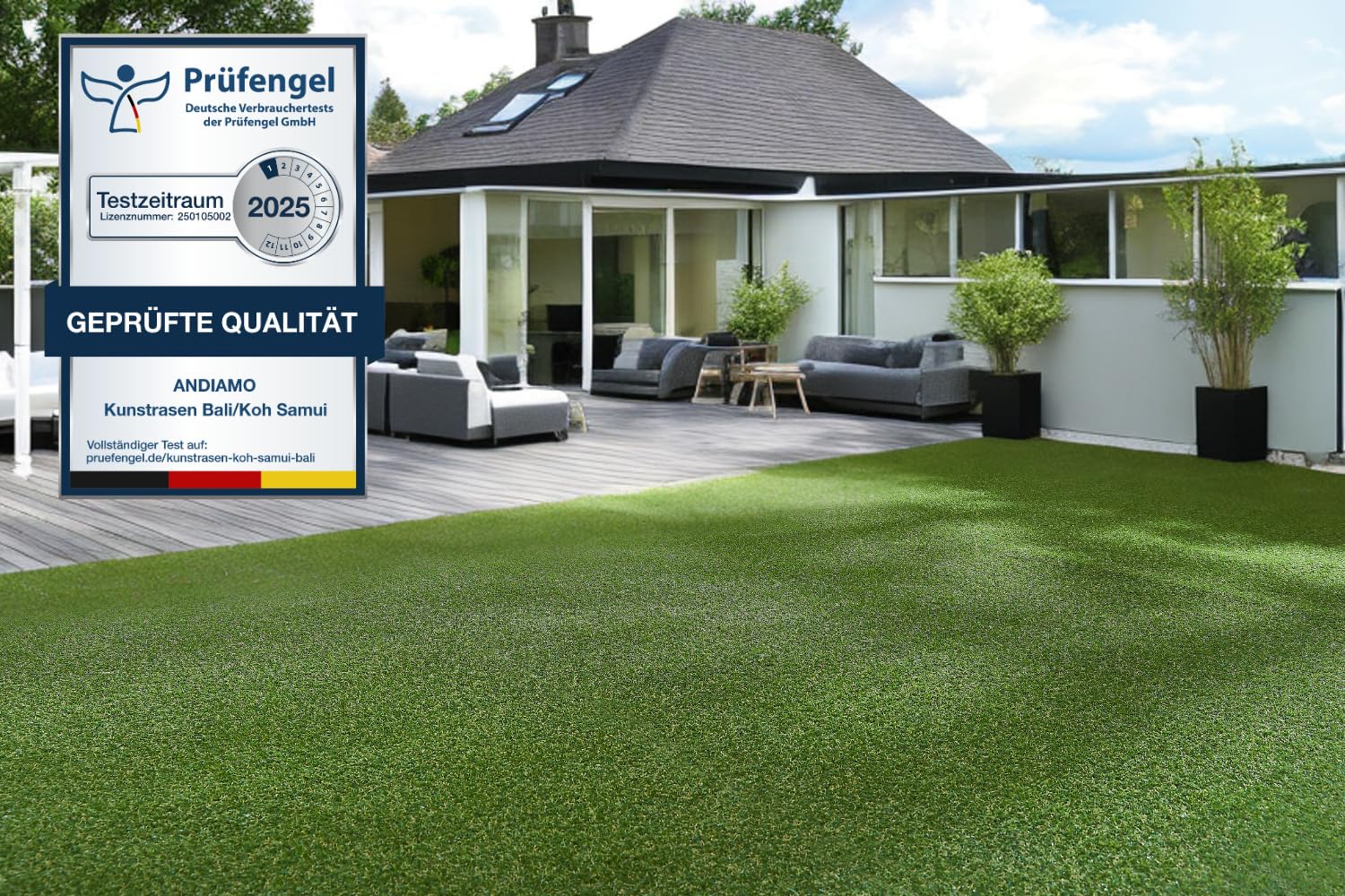 - Per una maggiore comodità. Dimentica il fastidioso taglio del prato, della concimazione o dell'irrigazione costante! Con il nostro prato artificiale potrete godere di una superficie sempreverde e impeccabile che rimane bella senza troppi sforzi – ideale per tutti coloro che preferiscono trascorrere il loro tempo rilassato in giardino.