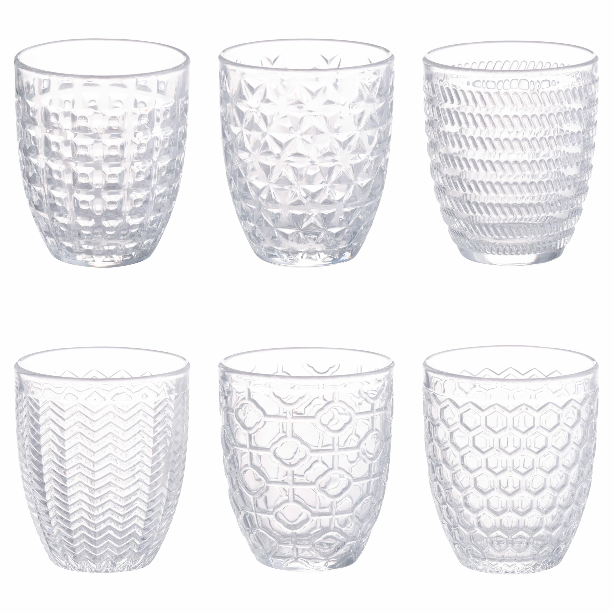 - Set 6 bicchieri acqua Geometrie Light In vetro Superficie con lavorazione a rilievo Misure: Ø 8,3 x h. 10 cm Capacità: 320 ml Lavabili in lavastoviglie Colore: trasparente