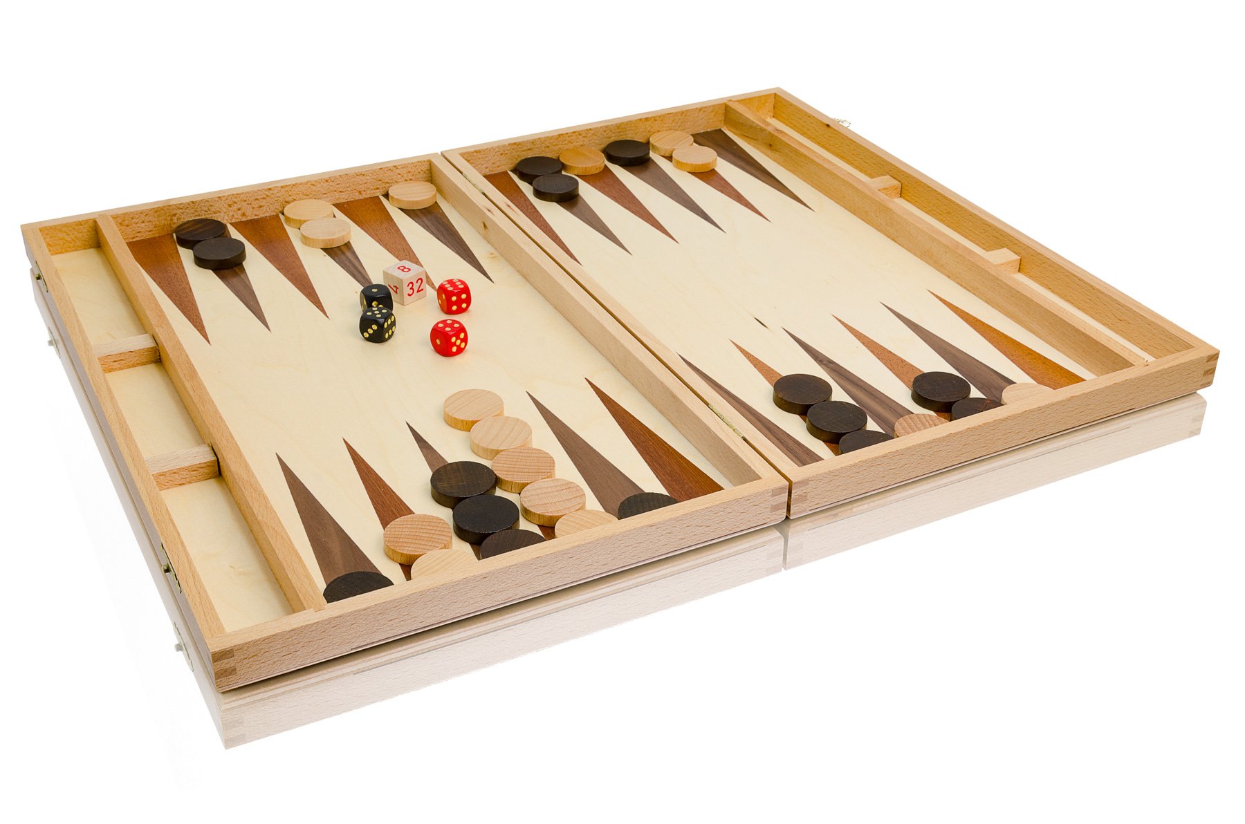 - Materiali selezionati - Il set di gioco non contiene parti in plastica. Il cofanetto, che funge anche da scacchiera per il backgammon, è fatto di legno di faggio, con campi di gioco triangolari incastonati. Le pedine del gioco sono fatte di legno di sicomoro.