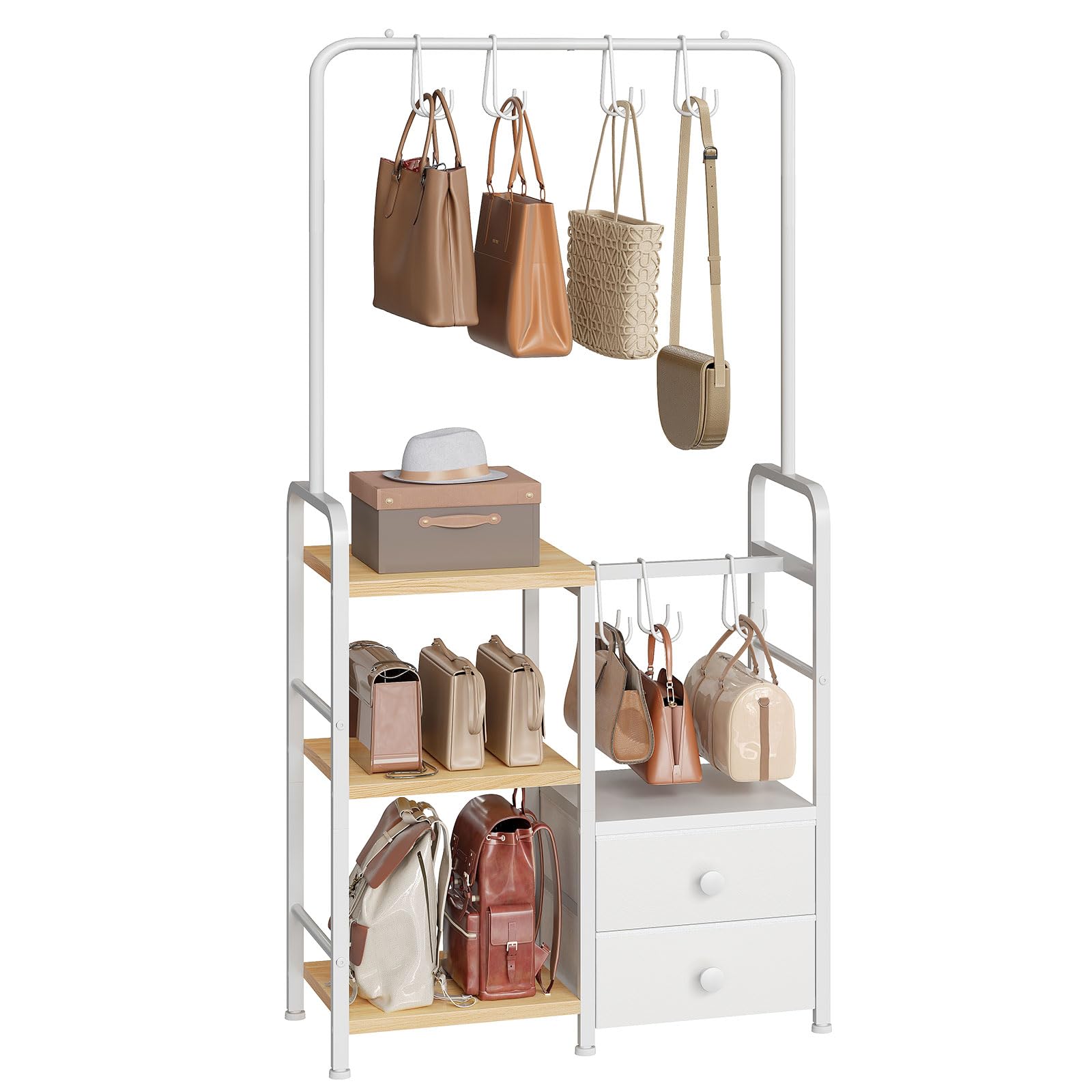 - Ampio scaffale porta borse con cassetti: Dotato di 3 ripiani in legno, 2 cassetti in tessuto per gioielli e 7 ganci removibili, offre uno spazio dedicato e versatile per borse, accessori e piccoli oggetti