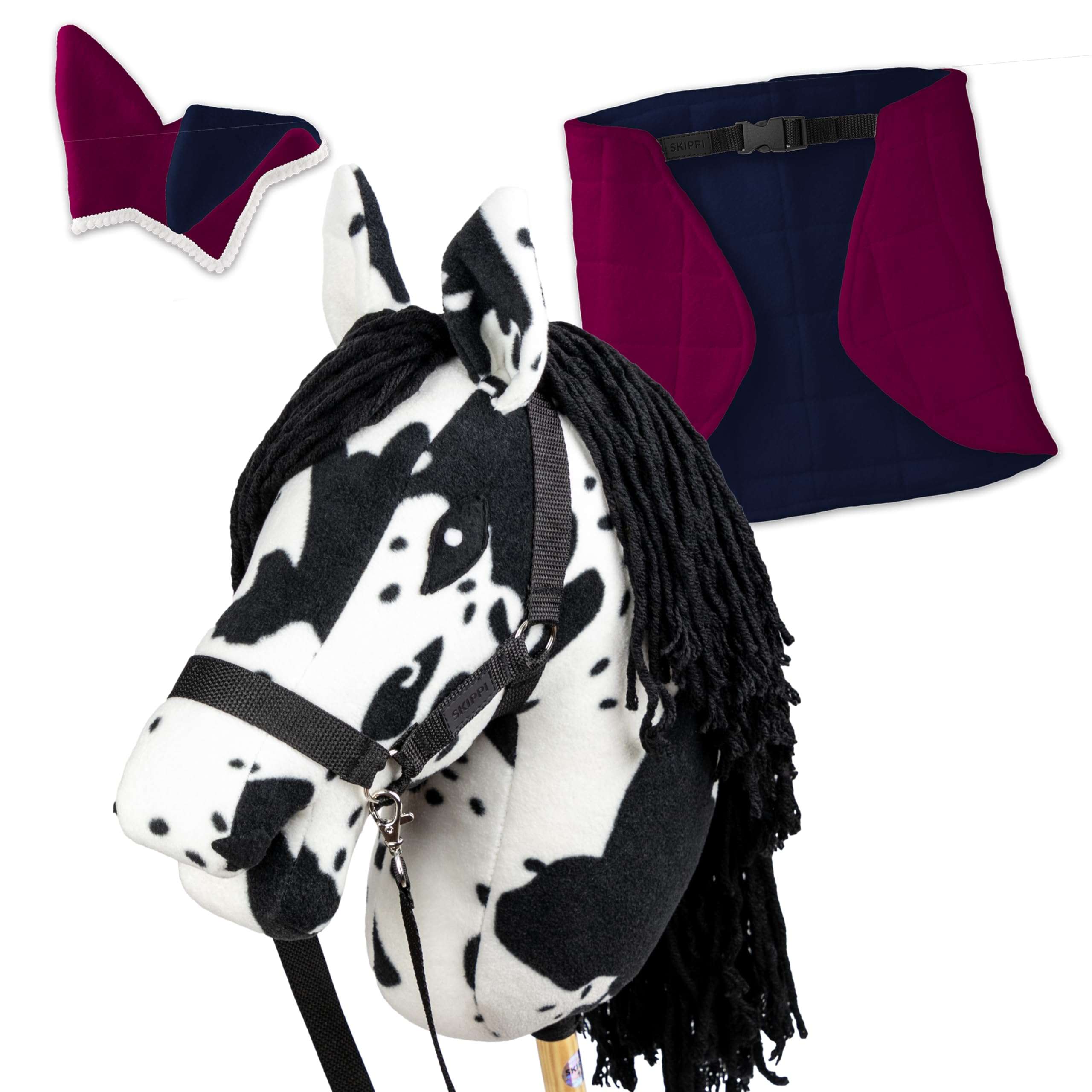 - Il set Skippi comprende un cavallo Hobby Horse pezzato A3, una coperta reversibile con cuffia antimosche abbinata, oltre a una capezza e redini nere.