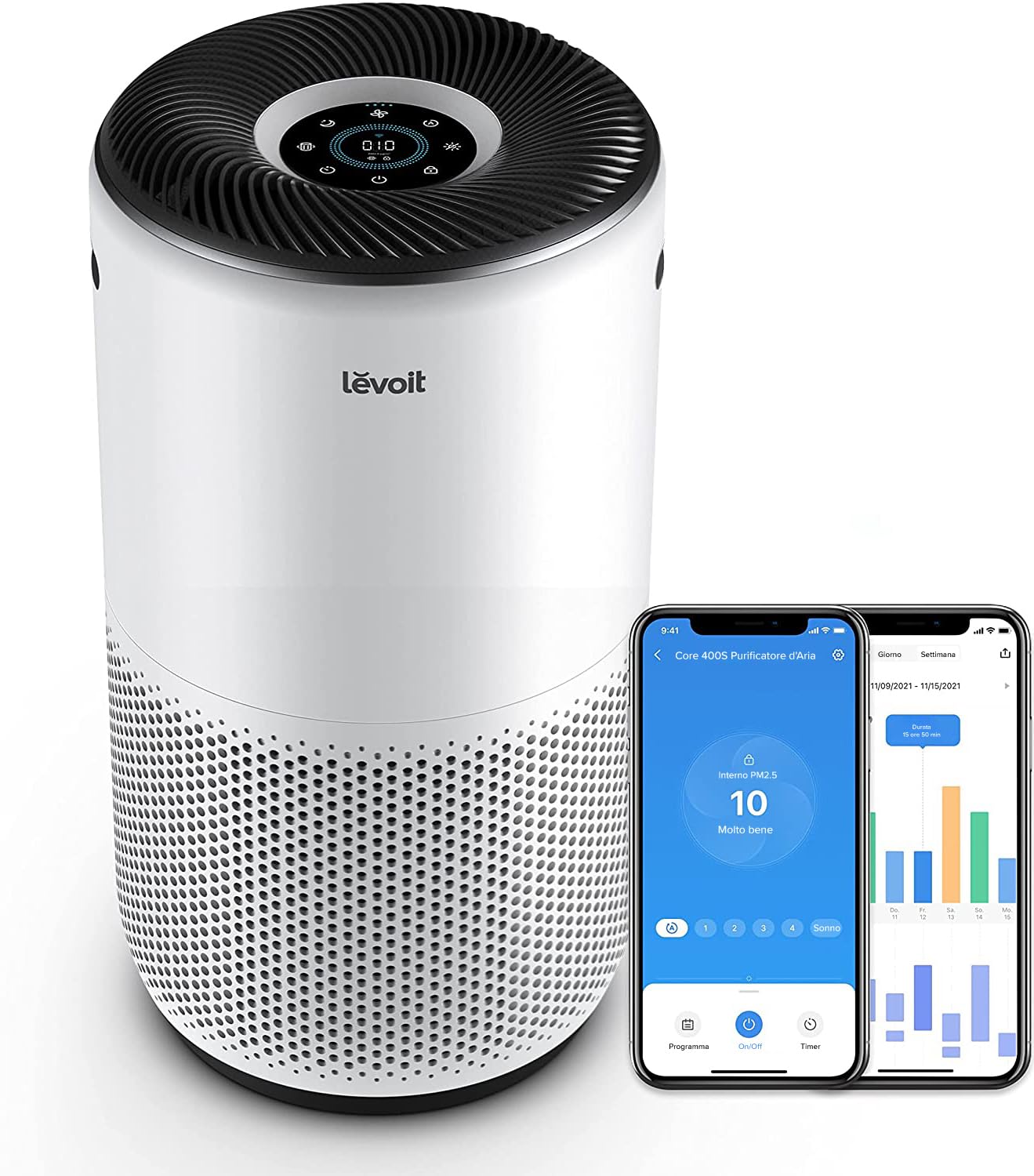 - Il purificatore d'aria Levoit Core 400S, con il suo design moderno, si integra armoniosamente in qualsiasi ambiente domestico, purificando efficacemente grandi spazi e offrendo un eccellente rapporto qualità-prezzo.