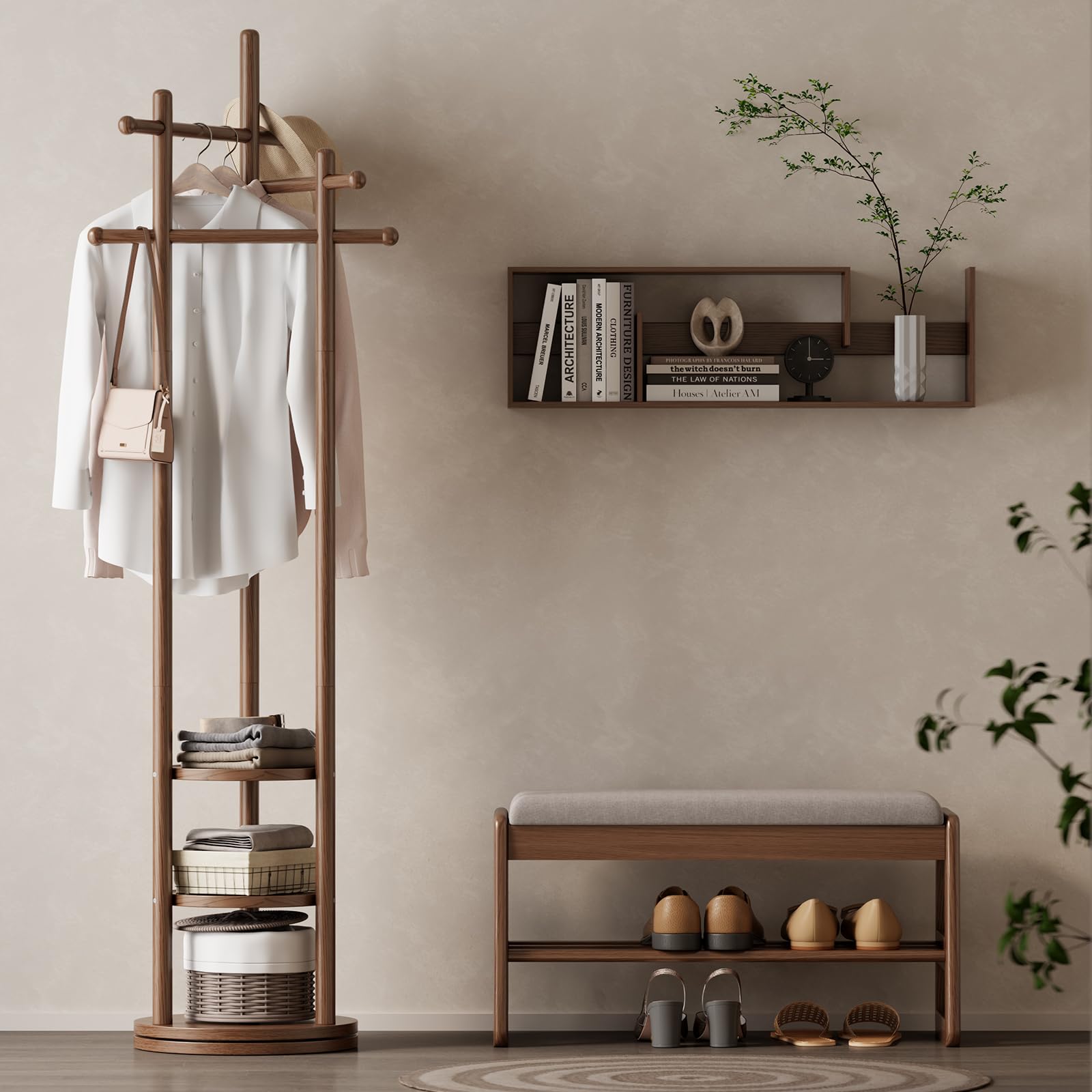 In legno · 3 supporti e 4 piani di stoccaggio · Per cappotti, cappelli, borse