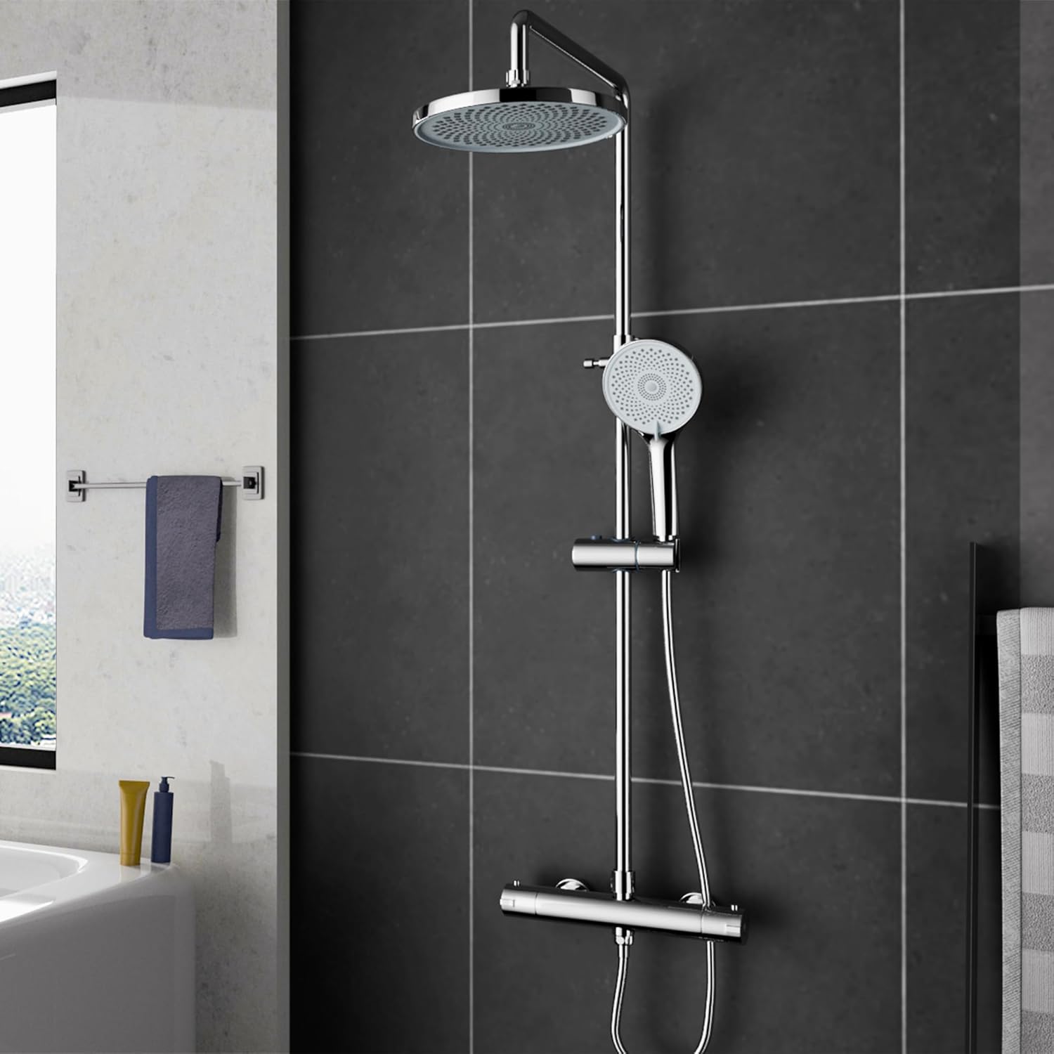 - La colonna doccia MORADO è dotata di un miscelatore termostatico che bilancia rapidamente la pressione di acqua calda e fredda, mantenendo una temperatura costante per il massimo comfort. Include un blocco di sicurezza a 38°C per una protezione aggiuntiva.