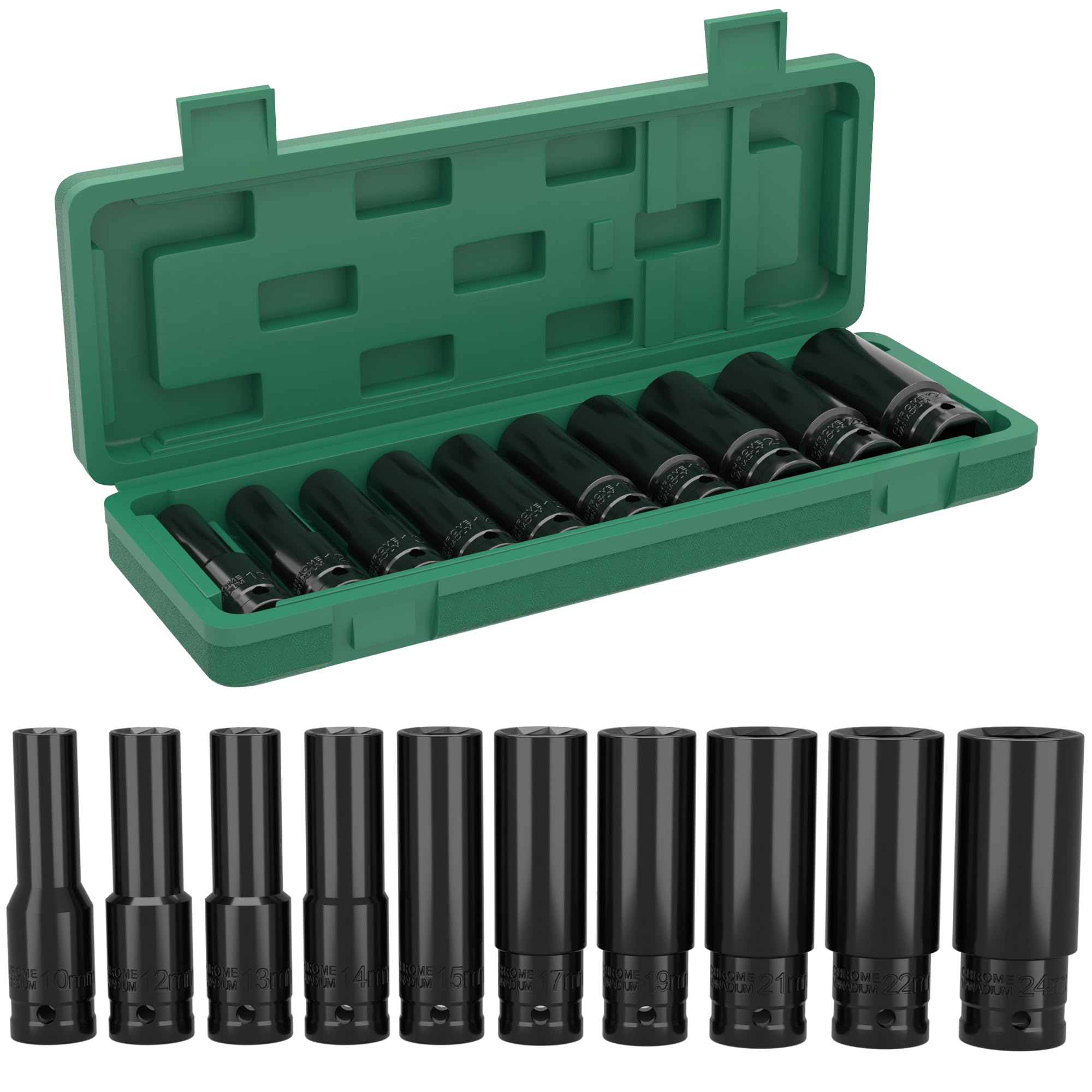 - Set di 10 bussole a impatto da 1/2 pollice con misure metriche da 10 a 24 mm, con una profondità di 78 mm per dadi più lunghi.