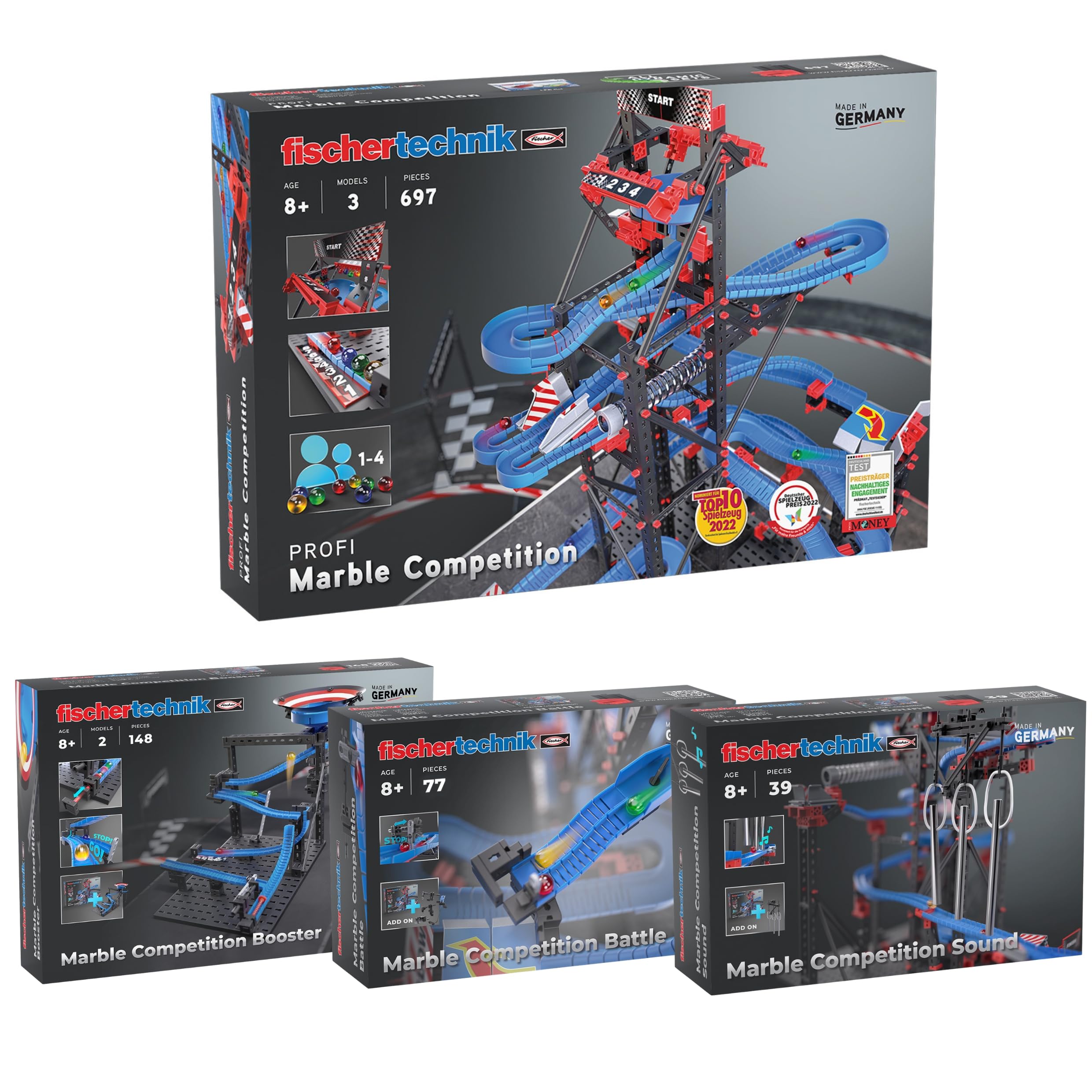 - Questo entusiasmante giocattolo di costruzione fischertechnik offre numerosi componenti d'azione per creare diverse piste per gare a sfera cronometrate, sia da soli che con gli amici. Il set completo include la pista Marble Competition e gli Add Ons Booster, Battle e Sound.