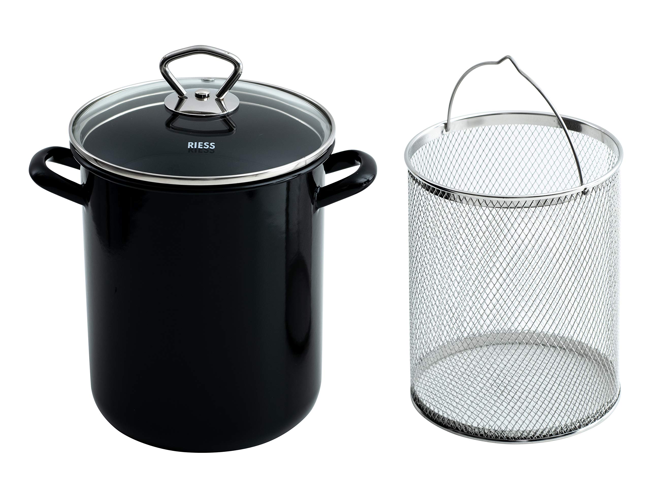 - Vaso alto in tre pezzi in smalto, composto da pentola alta, inserto con manico e coperchio in vetro, bordo bordo, maniglie smaltate