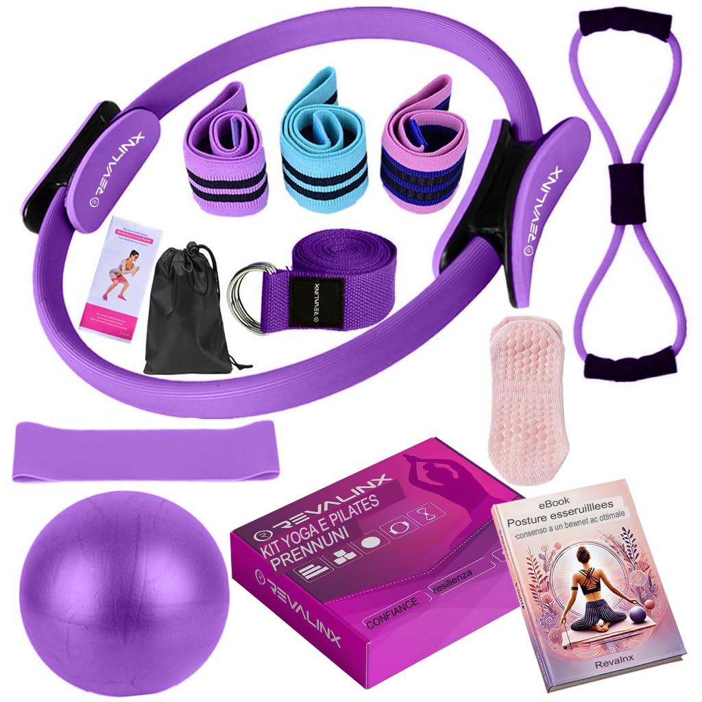- 🎯 Kit Pilates Completo 9 in 1 per Allenarsi Ovunque Il set Revalinx contiene tutto ciò che serve per una sessione completa di Pilates e yoga: anello Pilates, palla anti-scoppio, 3 bande elastiche con diversa intensità, fascia in lattice, fascia stretching e calzini antiscivolo. Ideale per allenamento a casa o in palestra.