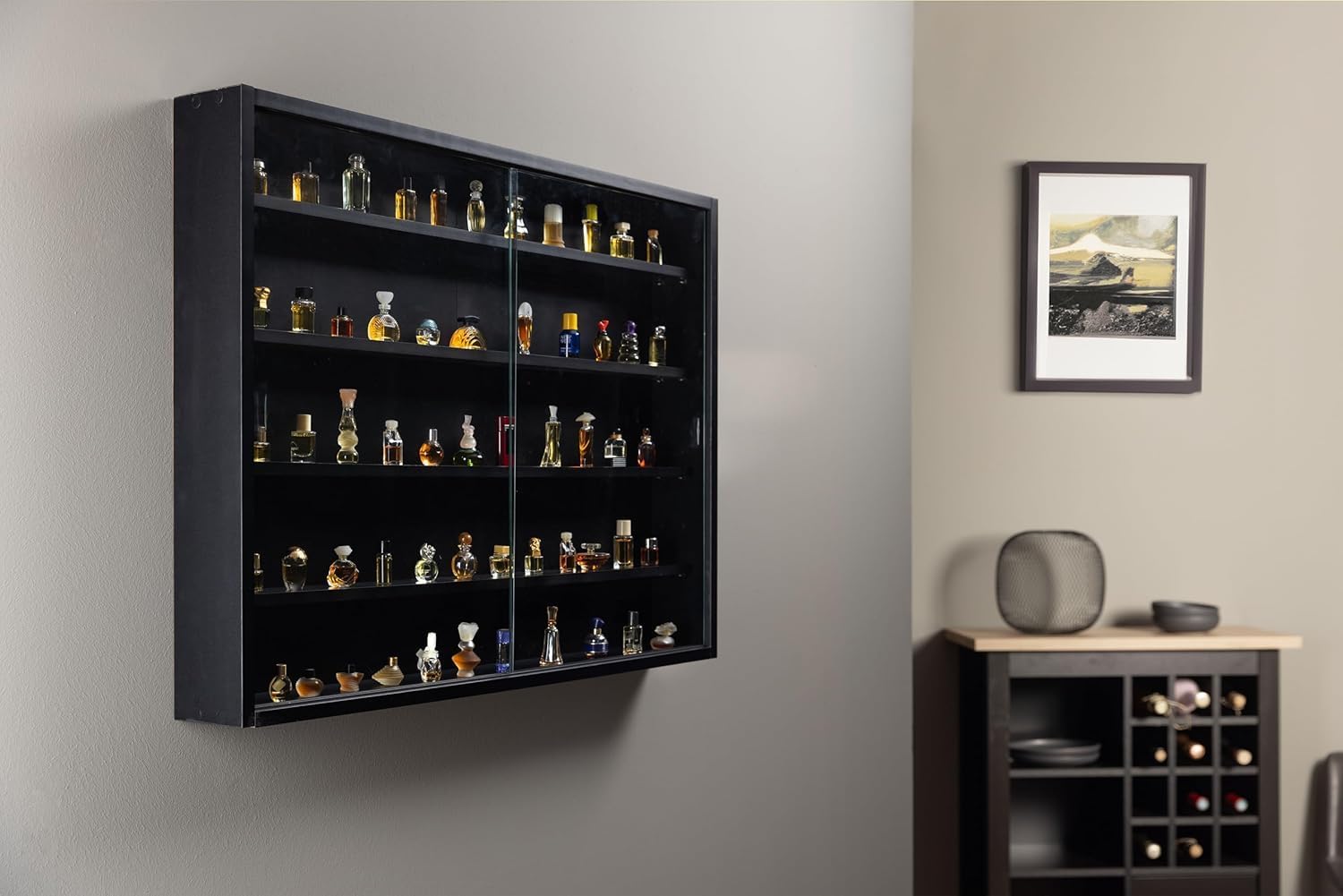 - Questa vetrina sospesa presenta un design elegante con quattro ripiani interni, ideale per esporre con stile oggetti da collezione come modellini, statuette o gioielli, ed è dotata di due porte scorrevoli in vetro che si integrano perfettamente nella struttura.