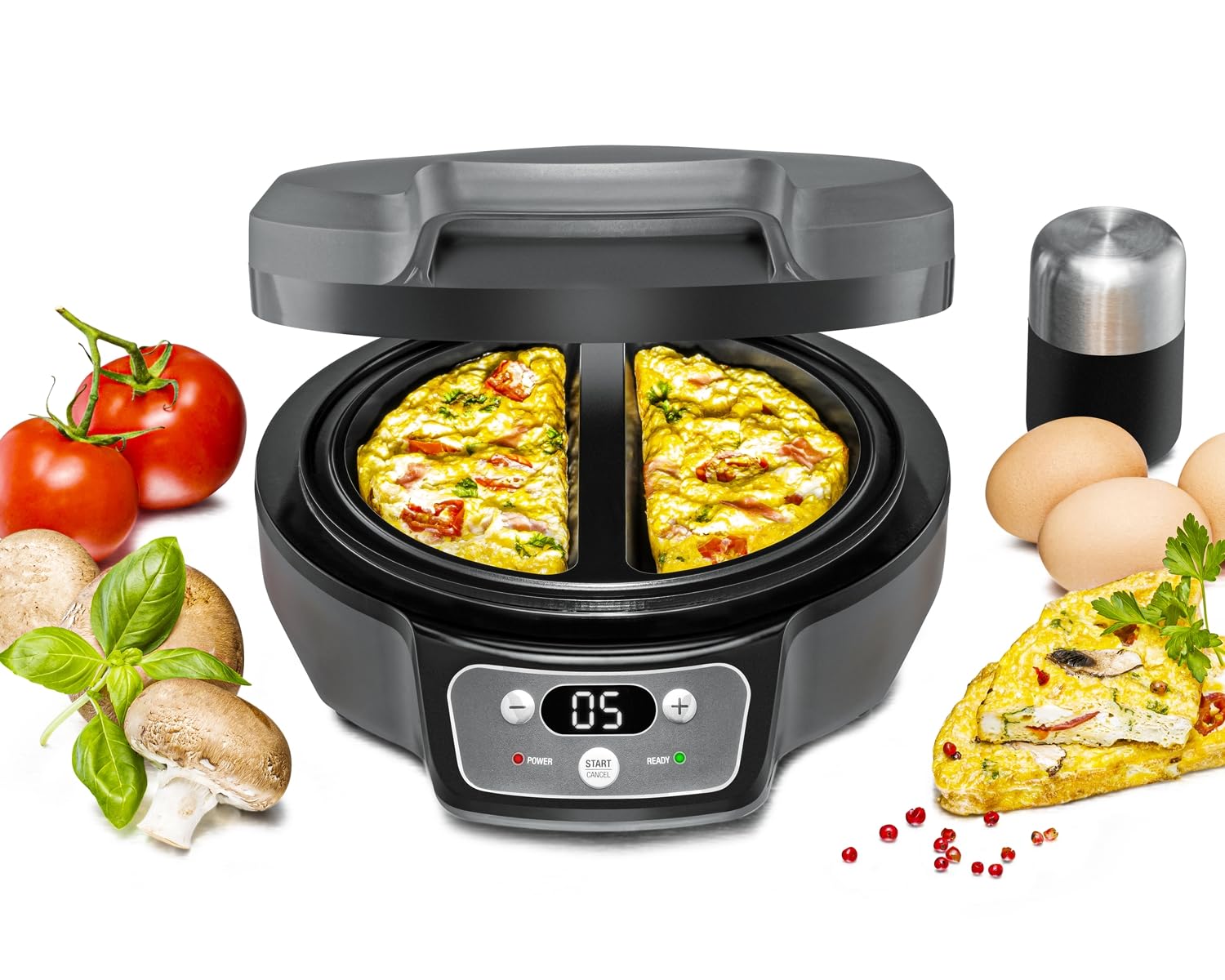 - Alloggiamento Cool-Touch di alta qualità, vassoi extra profondi per preparare contemporaneamente 2 frittate ariose