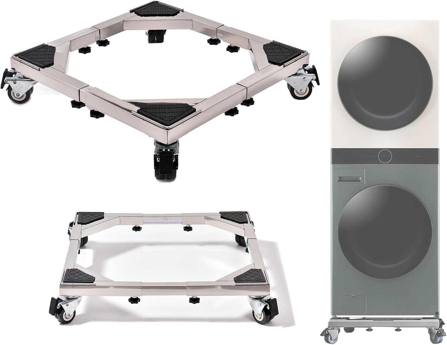 - Equipaggiato con 4 tubi in acciaio rinforzati, 4 robuste doppie ruote girevoli a 360 gradi e 4 piedini antiscivolo, questa base mobile è in grado di supportare fino a 544 kg, rendendola adatta per lavatrici, frigoriferi, asciugatrici, mini frigoriferi, armadi e condizionatori d'aria.