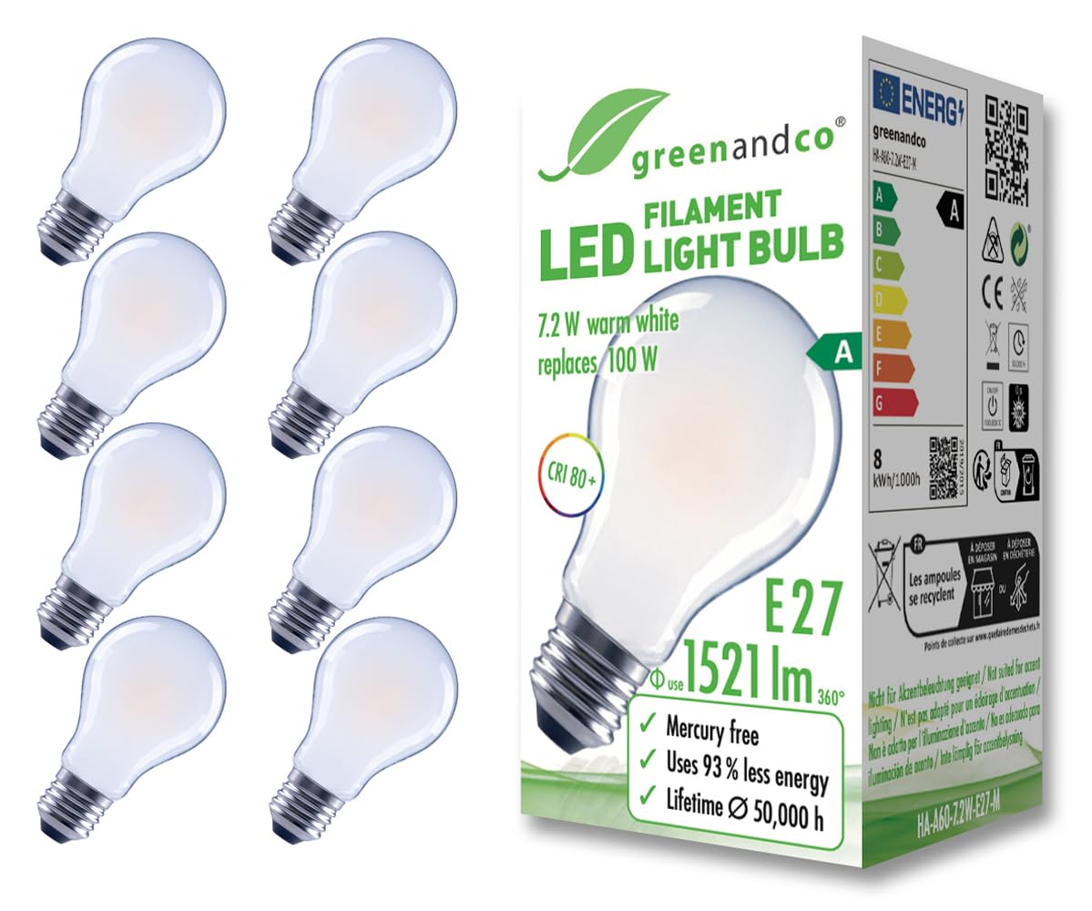 - Con un'efficienza energetica di classe A e oltre 210 lumen per watt, questa lampadina a filamento LED si posiziona tra le più efficienti sul mercato. Sostituisce le lampadine E27 da 100 W con un consumo di soli 7,2 W, offrendo un risparmio energetico superiore al 93%.