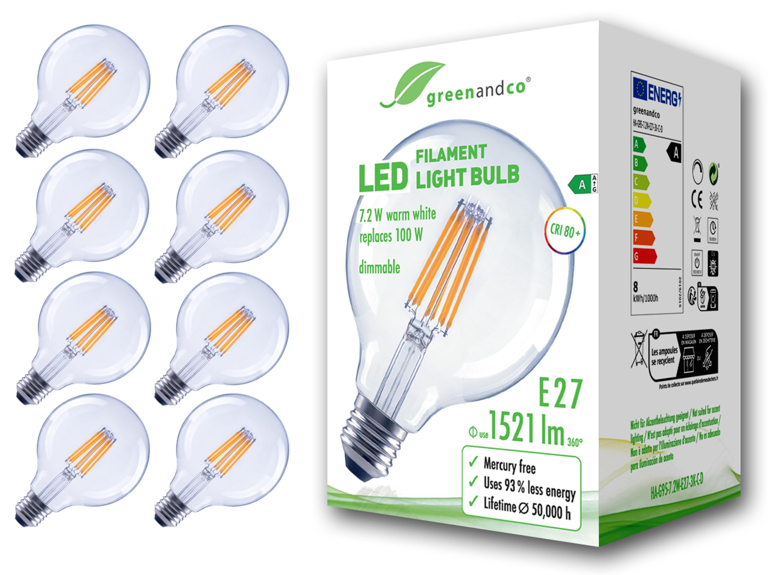 Greenandco 8 Lampadine LED Filamento E27 G95 7.2W