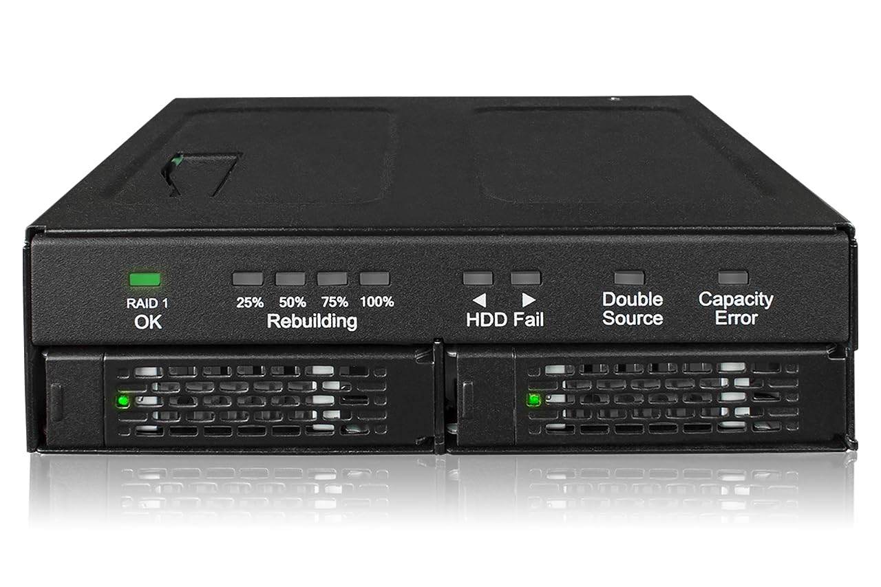RAID 1 / JBOD · Cornice intercambiabile per due SATA HDD/SSD 2,5" in 1 alloggiamento 5,25" · Metallo pieno