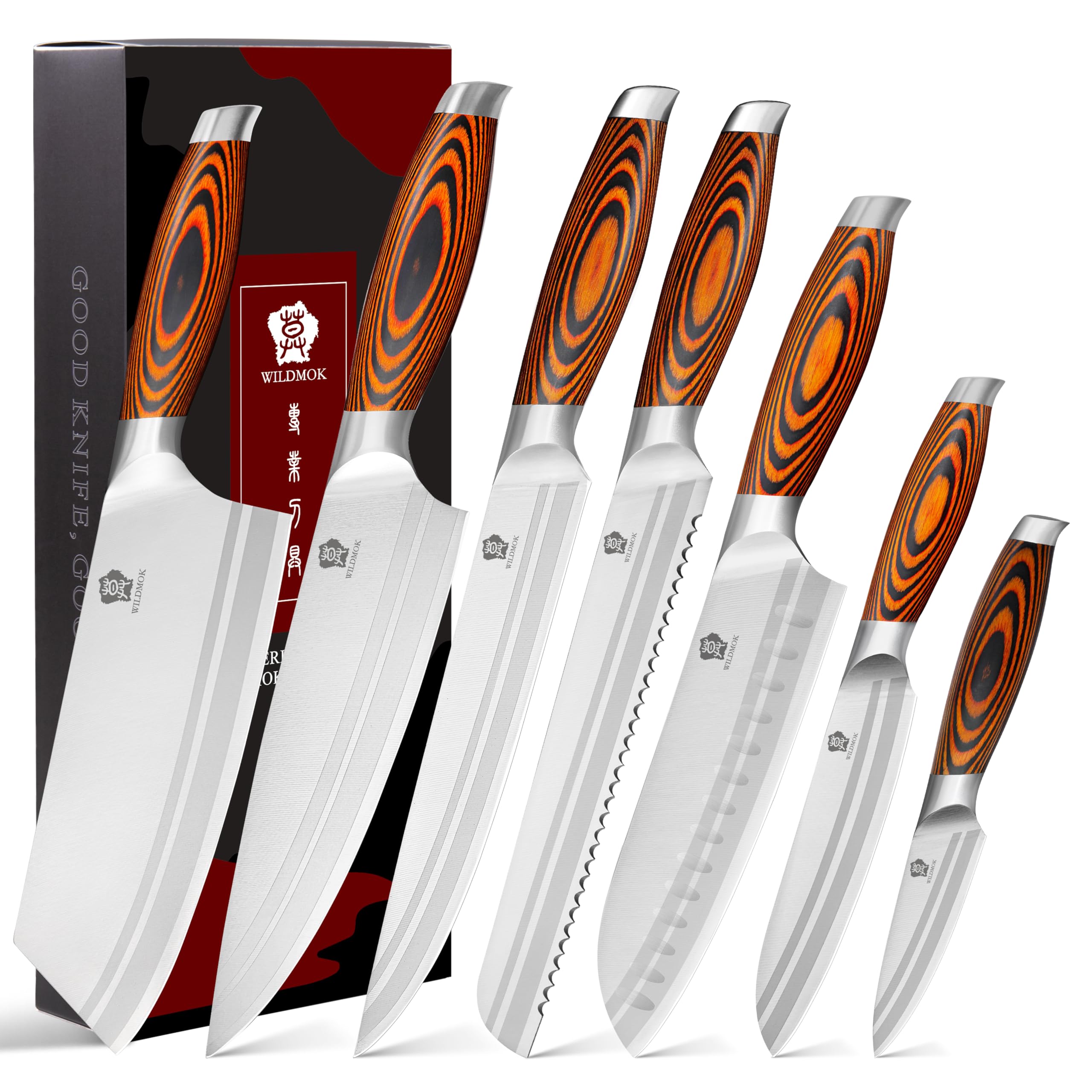 - 【Set di coltelli ben progettato】 Il set di 7 coltelli di posate WILDMOK include: 1 coltello da mannaia, 1 coltello da chef, 1 coltello da intaglio, 1 coltello da pane, 1 coltello santoku, 1 coltello multiuso, 1 coltello da frutta. Sono progettati per essere coltelli multiuso per case professionali e ristoranti.
