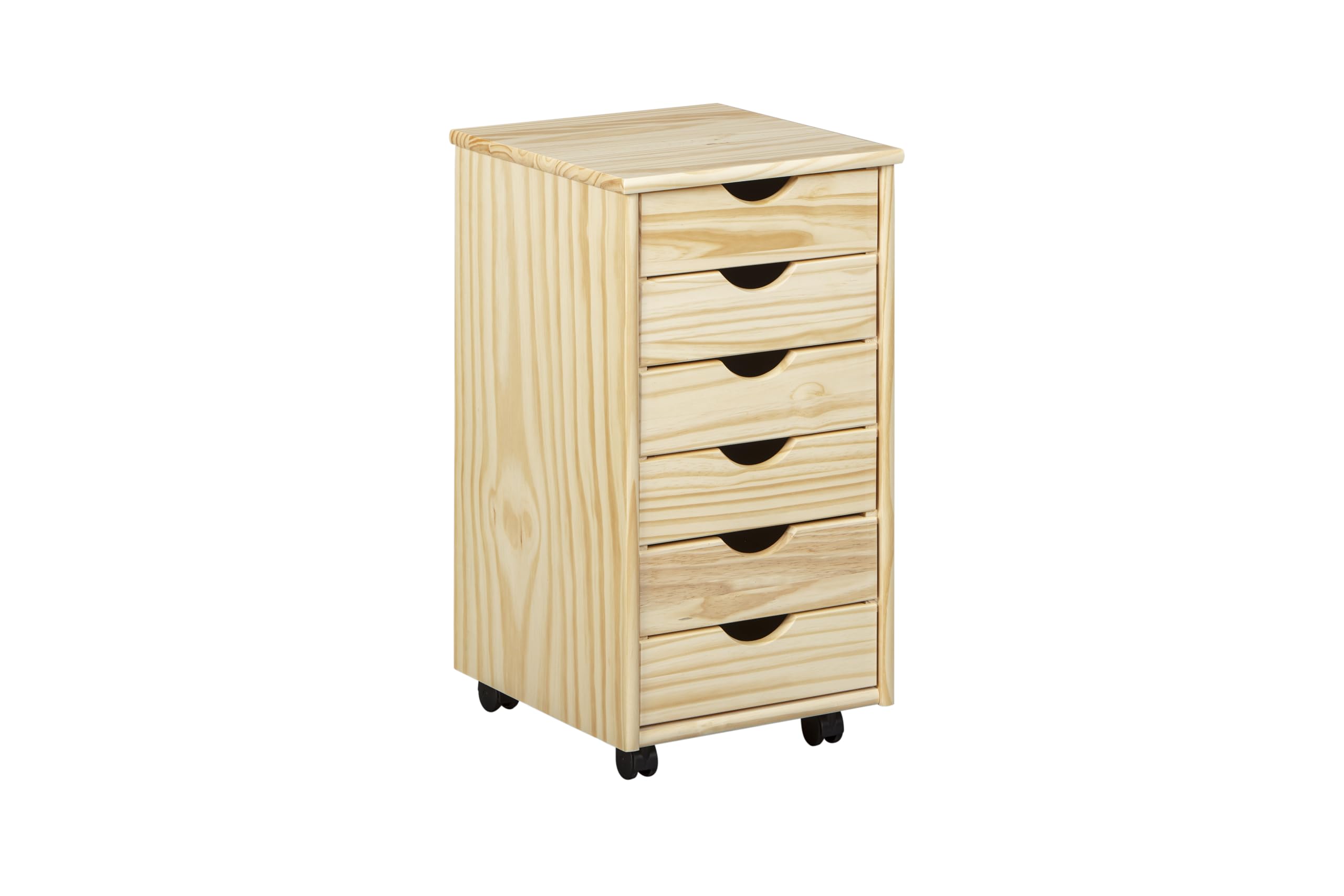 - La cassettiera è composta da 6 cassetti e 4 ruote, con una finitura in vernice naturale che esalta il pino incenso, un legno di qualità.