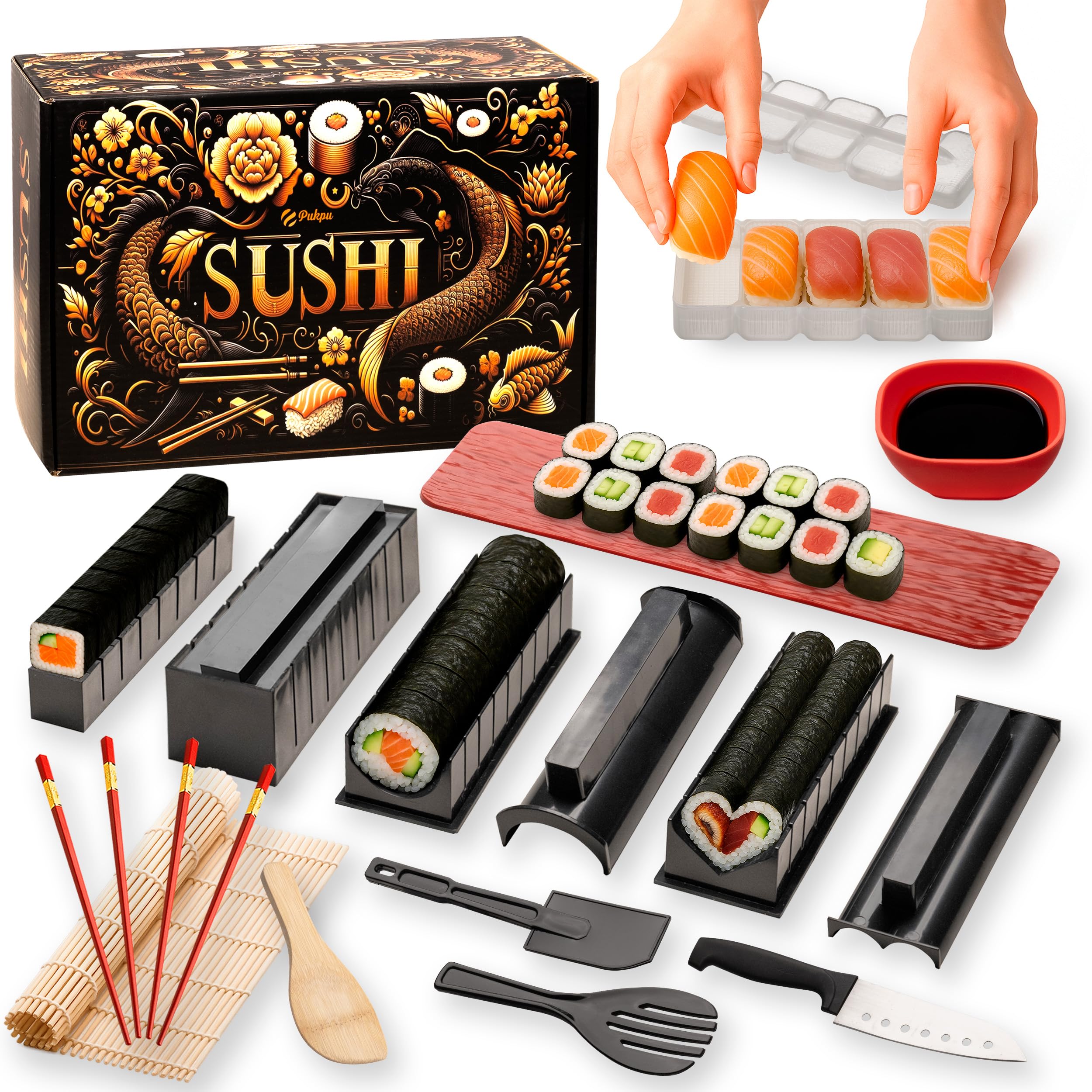 - Questo è un kit completo per la preparazione del sushi, composto da 15 utensili, inclusi 4 paia di bacchette riutilizzabili con supporto, stampi per nigiri e per dare diverse forme al sushi, un coltello, un tappetino in bambù, spatole in legno e plastica, una spatola per spalmare, una ciotola e un vassoio.