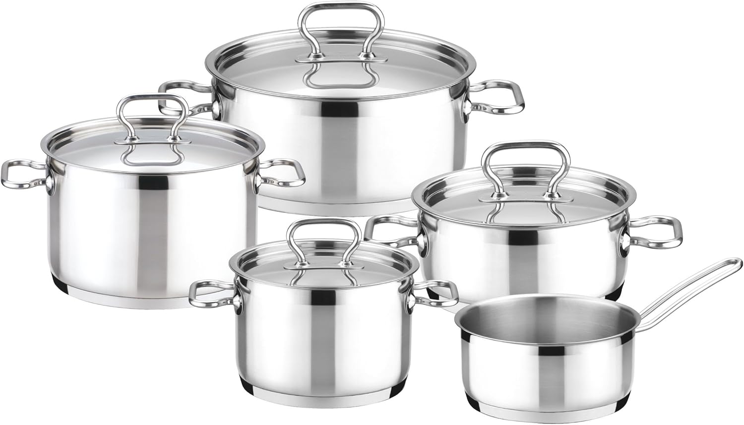 - Il set di pentole include una casseruola da 1.5 L, una pentola con coperchio da 2 L, una casseruola con coperchio da 3 L, una pentola con coperchio da 4 L e una casseruola con coperchio da 5 L.