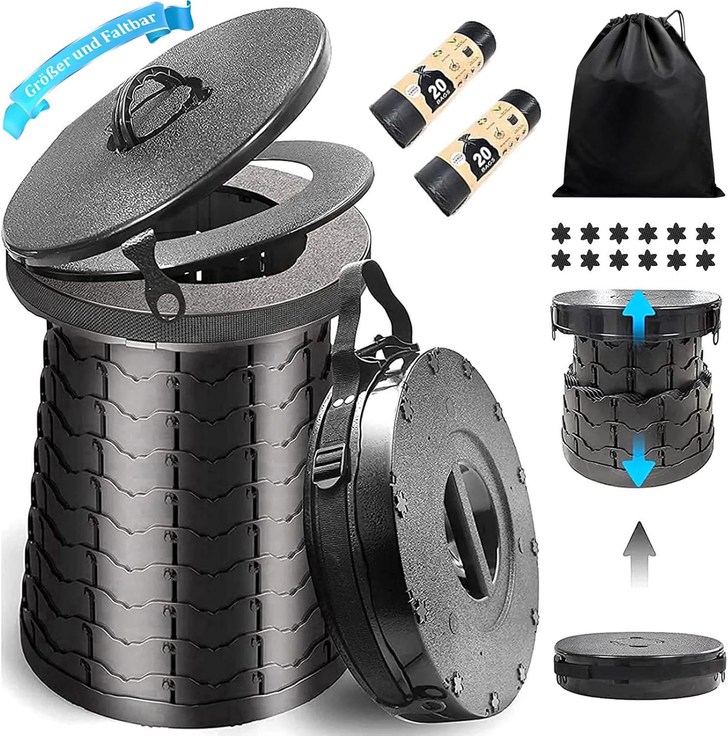 - 【Contenuto della confezione】: 1 toilette da campeggio pieghevole, 40 sacchetti biodegradabili, 1 borsa portaoggetti, 1 manuale di istruzioni in tedesco/inglese. La toilette da campeggio XIUWOUG è adatta a tutte le persone di diverse dimensioni e peso ed è un must per gli amanti del campeggio