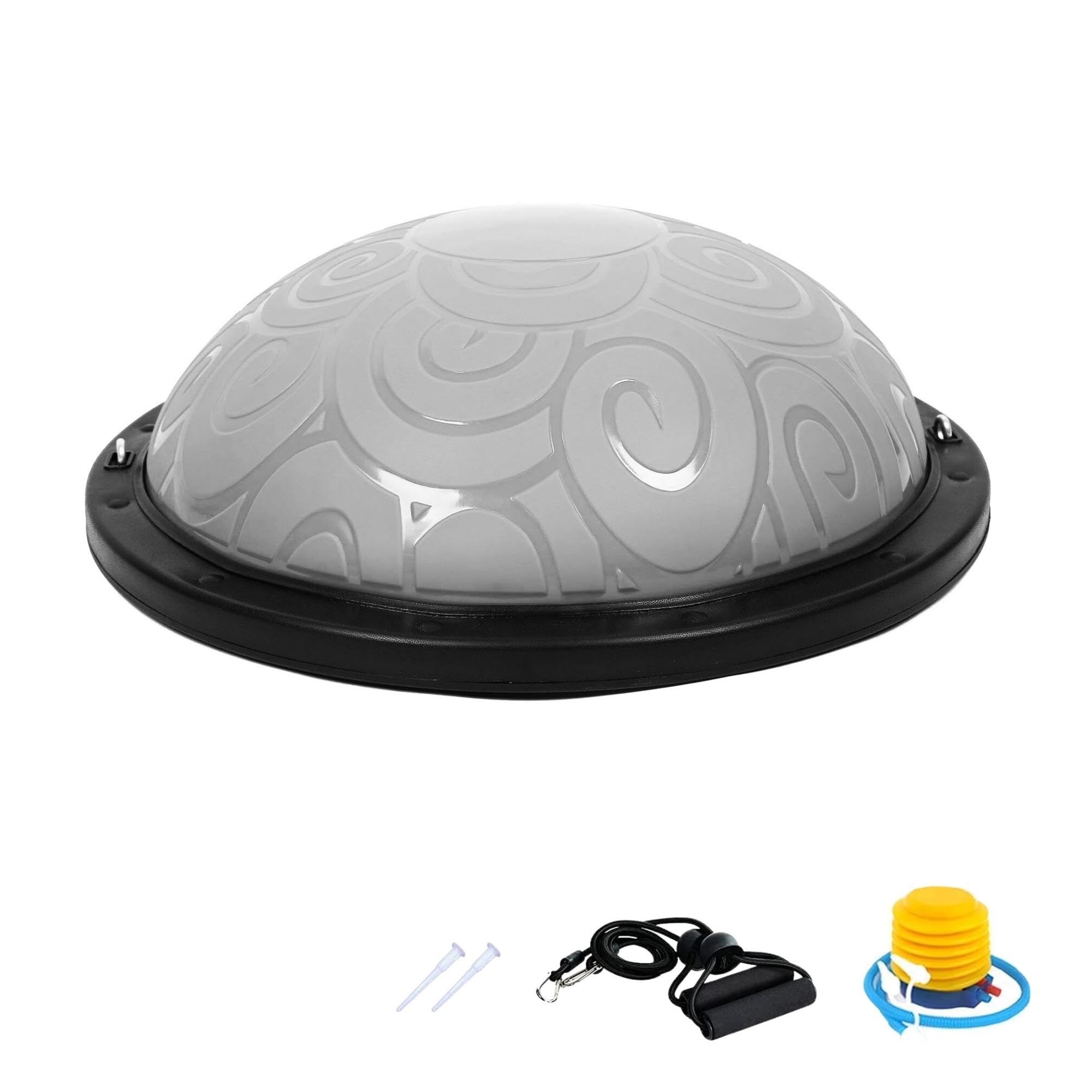- La confezione include una pompa a pedale per gonfiare facilmente la palla, due fasce di resistenza e due tappi di chiusura.