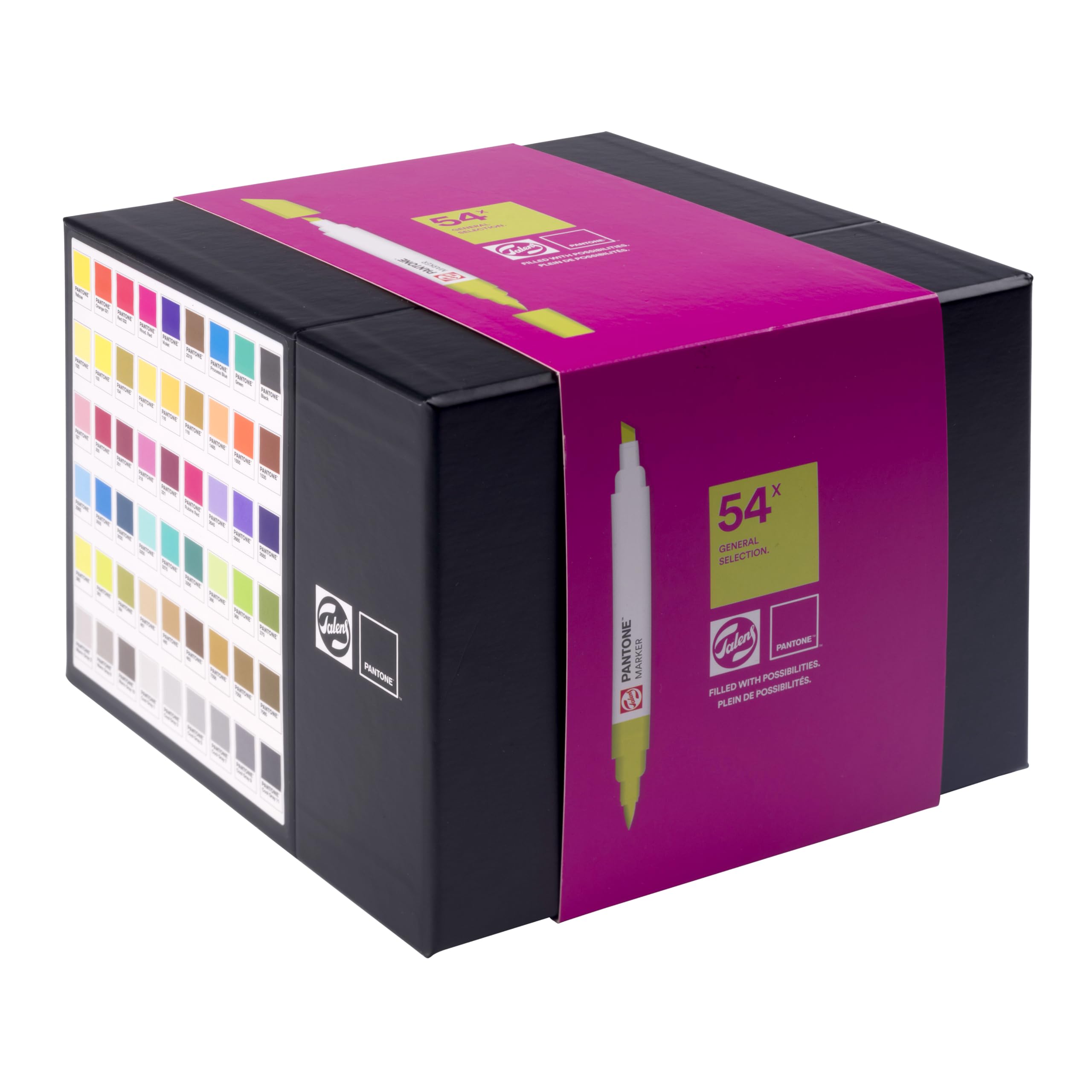 - Questo set contiene 54 pennarelli Talens | Pantone e viene fornito in una robusta scatola dal design elegante e orizzontale, per garantire che i tuoi pennarelli siano sempre pronti all'uso con un flusso d'inchiostro ottimale per entrambi i pennini. Grazie ai nomi dei colori e ai numeri sui cappucci, puoi scegliere facilmente il colore giusto per il tuo lavoro