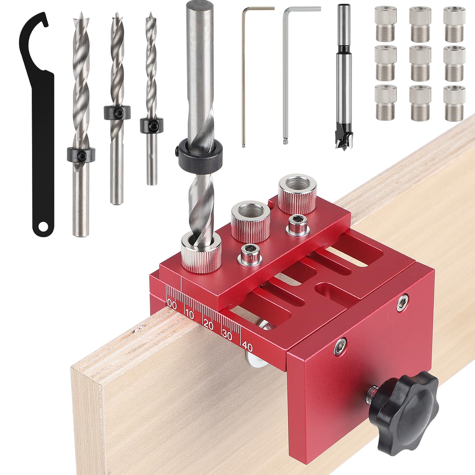 - Il set include una dima di foratura 3 in 1 in alluminio anodizzato, adatta per spessori di legno da 15 a 25 mm, con scala laser e istruzioni, ideale per la foratura e l'assemblaggio rapido e preciso di pannelli in legno.