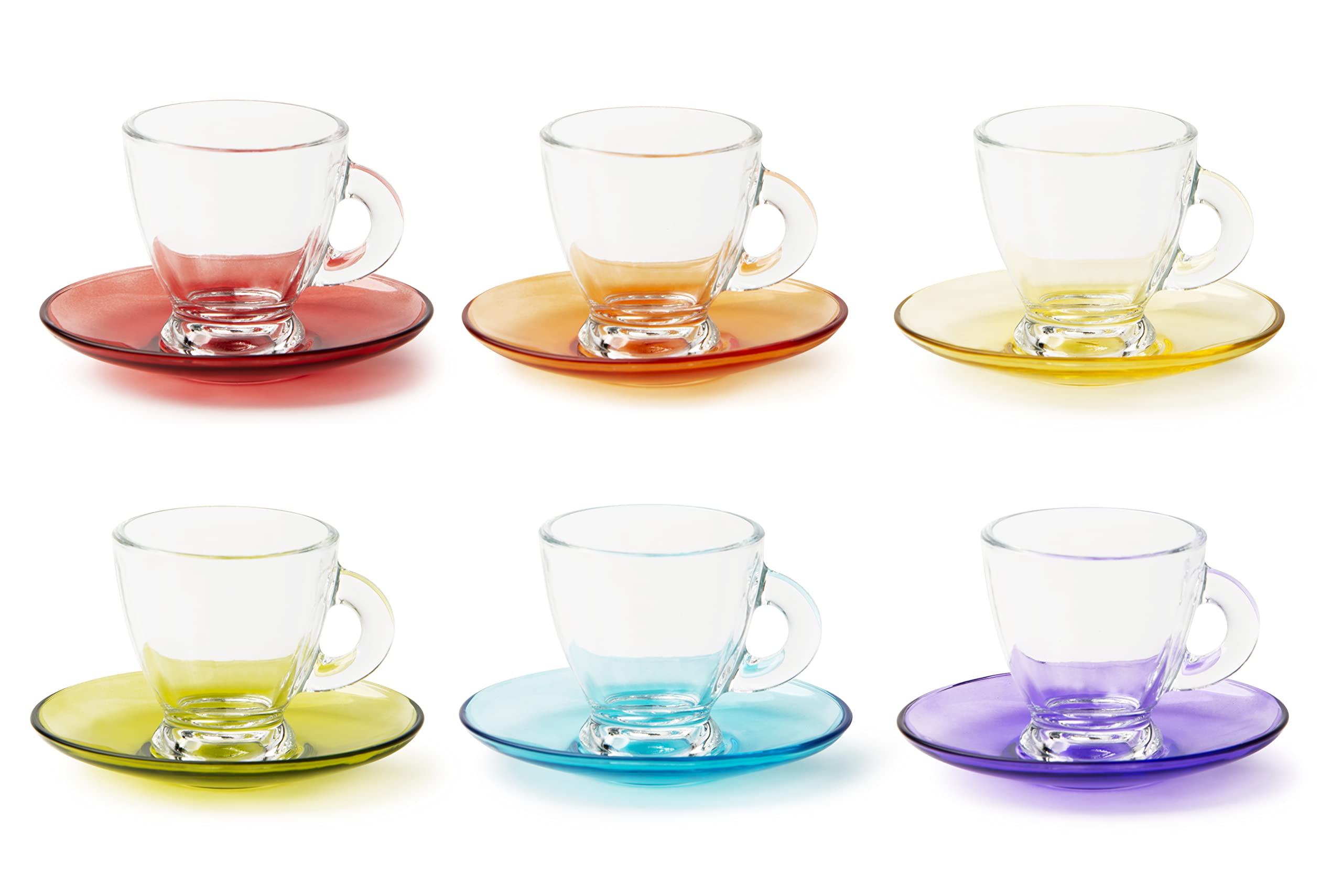 - Le tazzine sono trasparenti, mentre i piattini si distinguono per i loro colori vivaci: rosso, arancio, giallo, verde, azzurro chiaro e lilla.