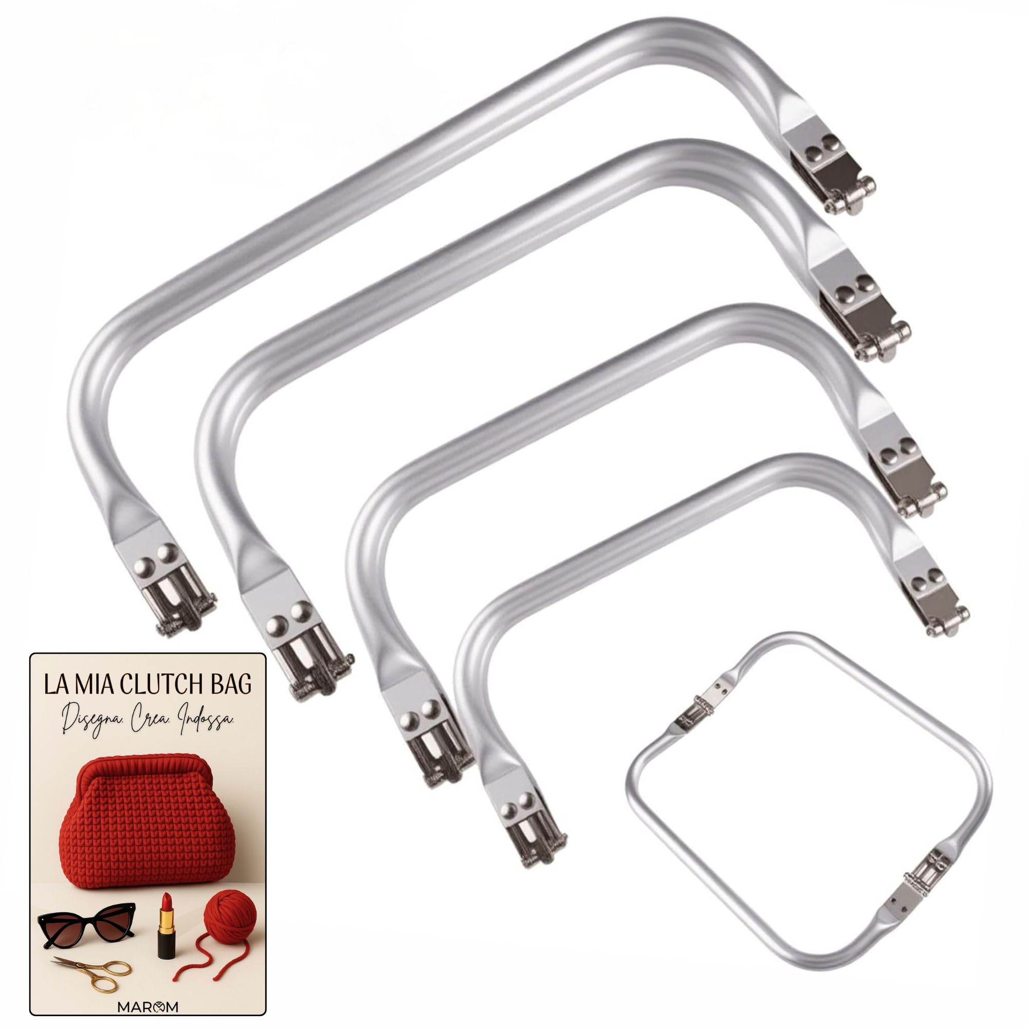 - Il kit MAROM include 4 chiusure a molla in alluminio di diverse dimensioni (160x90mm, 180x90mm, 200x92mm, 220x95mm), perfette per realizzare borse all'uncinetto uniche e personalizzate.