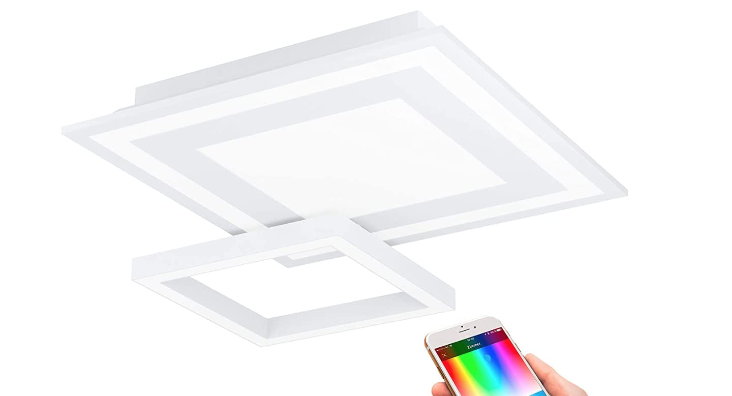 - La plafoniera quadrata Smart Home LED, realizzata in acciaio bianco con coperture in plastica bianca e un elemento luminoso orientabile fino a 355°, si adatta perfettamente alle tendenze del design moderno.