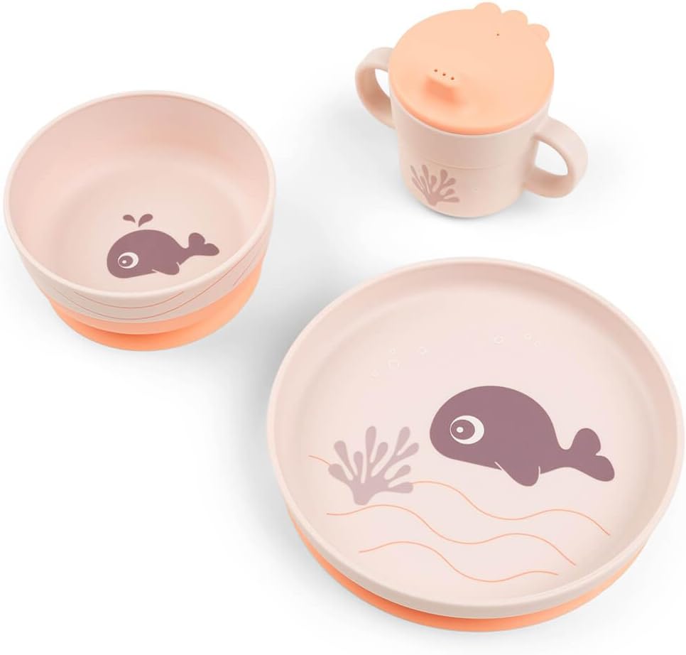 - Include un piatto e una ciotola, entrambi dotati di ventosa antiscivolo e bordo rialzato per facilitare l'apprendimento e ridurre gli spargimenti.