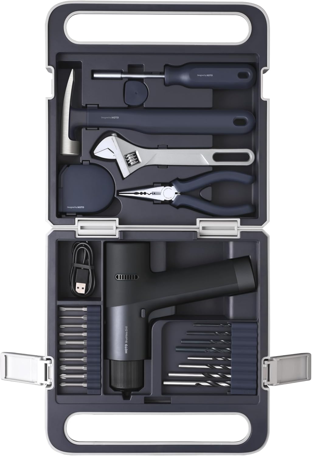 - La cassetta degli attrezzi è completa e include: una custodia portatile, un cacciavite manuale, una chiave regolabile, un martello da carpentiere, un cappuccio per martello in gomma, una pinza ad ago, un metro a nastro autobloccante da 3 metri, dieci punte in acciaio S2, otto punte da trapano in acciaio S2 e un cavo USB-C.