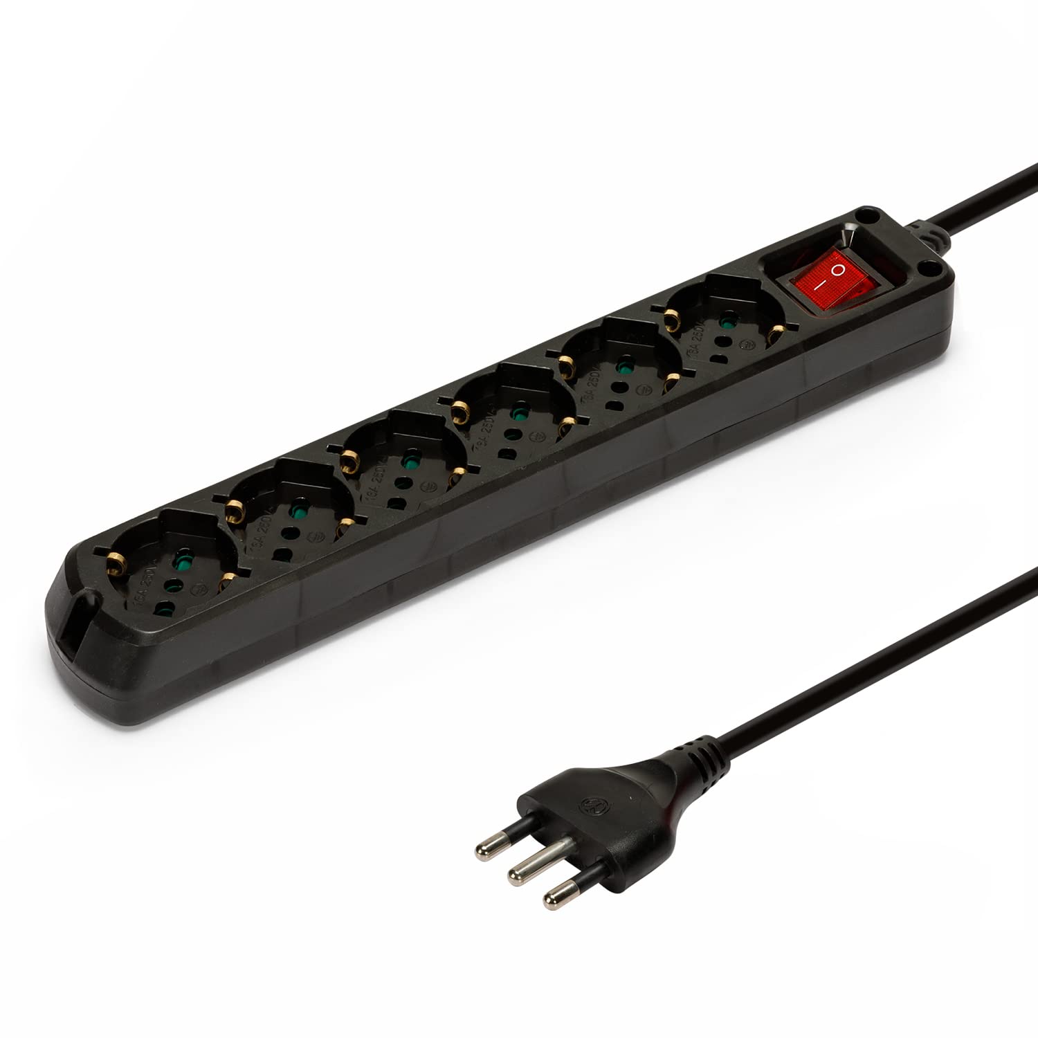 - Questa multipresa offre sei prese polivalenti, compatibili con spine Schuko e spine italiane sia da 10A che da 16A, garantendo la massima versatilità per collegare una vasta gamma di dispositivi senza necessità di adattatori.