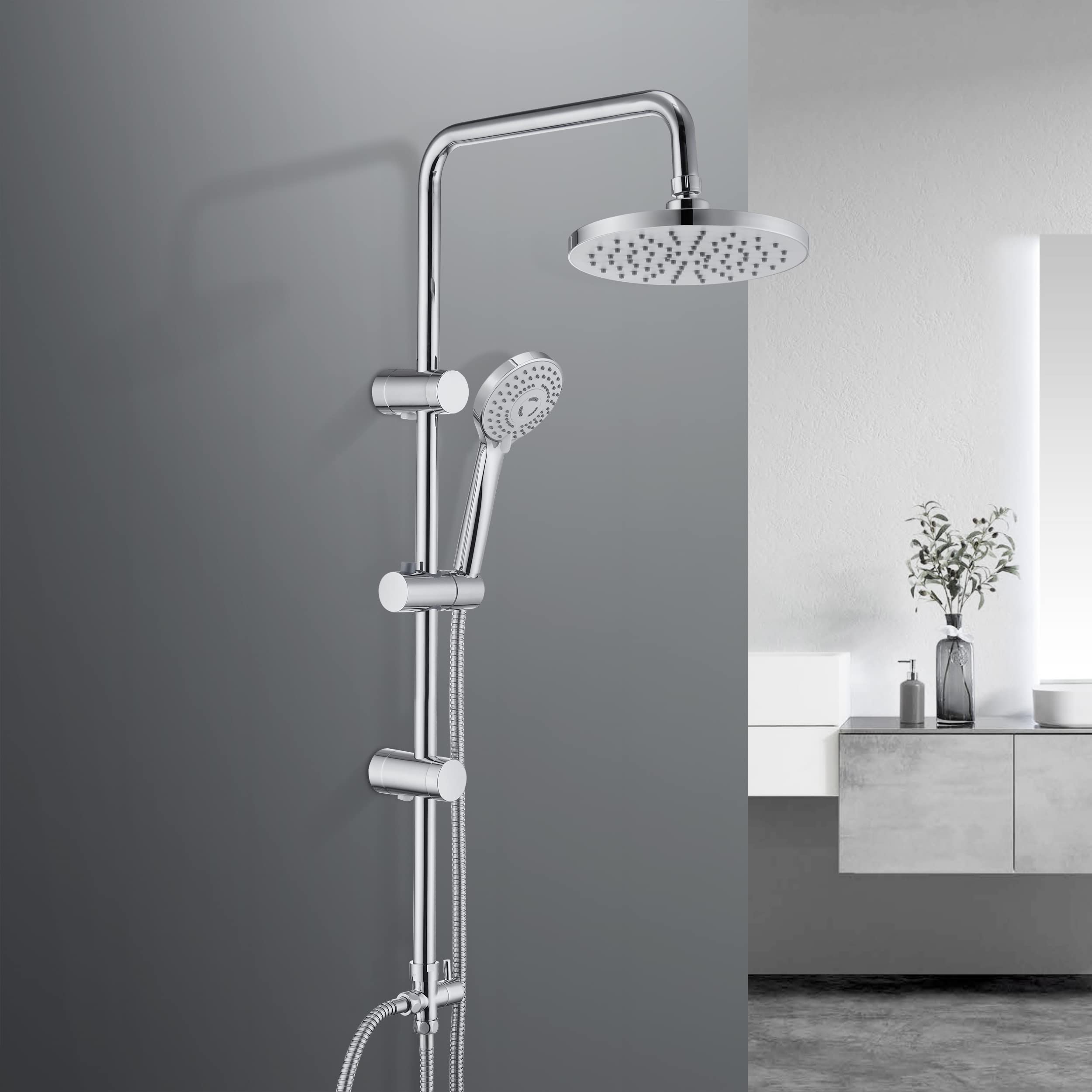 - Il soffione e la doccetta, realizzati in ABS cromato, sono dotati di ugelli anticalcare che permettono una facile rimozione dei depositi con un semplice tocco. La doccetta offre tre funzioni di getto: pioggia, massaggio delicato e massaggiante, ed è progettata per resistere alla ruggine e durare a lungo.
